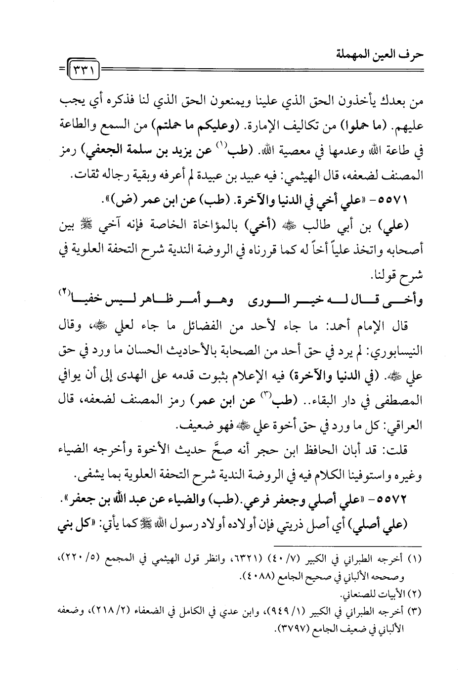(¬2) كما سيأتي حكم عليه الذهبي بالوضع ولا يستفاد منه حكم. قال الحافظ ابن حجر في الإصابة (7/ 312): والظن بالصحابة في تلك الحروب أنهم كانوا فيها متأولين وللمجتهد المخطئ أجر وإذا ثبت هذا في حق آحاد الناس فثبوته للصحابة بالطريق الأولى". وراجع للتفصيل المقدمة.