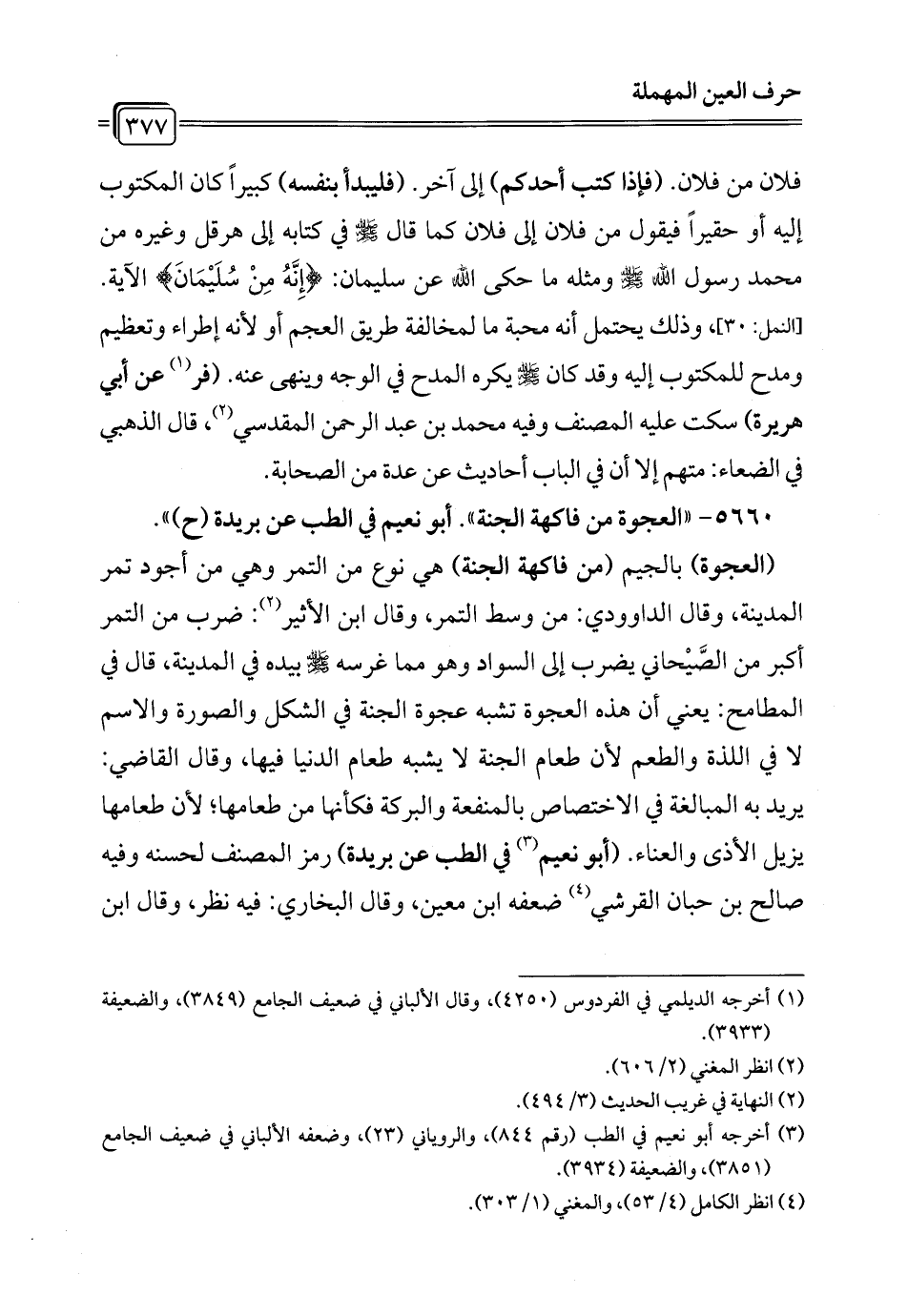 5663 - "العجوة من الجنة، وفيها شفاء من السم، والكمأة من المن، وماؤها شفاء للعين، والكبش العربي الأسود شفاء من عرق النسا، يؤكل من لحمه، ويحسى من مرقه". ابن النجار عن ابن عباس".