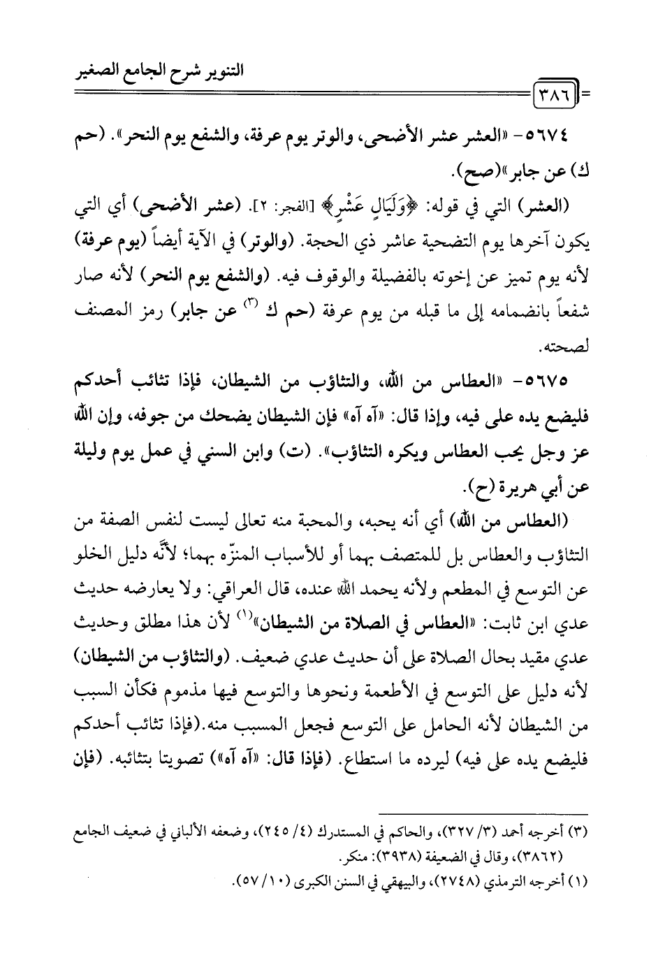 وهذا يعارض هذا الحديث وفي إسناده ضعف، وأجاب المصنف في فتاويه بأن المراد التثاؤب والعطاس في الصلاة كلاهما من الشيطان لكن العطاس في الصلاة أحب إلى الله من التثاؤب فيها، والتثاؤب أكره إليه من العطاس فيها وعليه يحمل حديث ابن أبي شيبة فهو راجع إلى تفاوت رتب بعض المكروه على بعض انتهى.