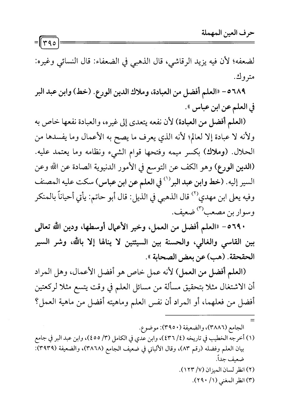 ثلاثة. (وما سوى ذلك فهو فضل) زائد لا ضرورة إلى معرفته، في المعرب: الفضل الزيادة، وقد غلب جمعه على ما لا خير فيه: فضول بلا فضل، وطول بلا طول، ثم قيل: لمن يشتغل بما لا يعنيه فضولي. (آية محكمة) أي لم تنسخ أو لا خفاء فيها أو لا خلاف فيها، وقال الطيبي: المحكمة التي أحكمت عبارتها بأن حفظت عن الاحتمال والاشتباه فكانت أم الكتاب أي أصله فتحمل المتشابهات عليها ويرد إليها ولا يتم ذلك إلا للماهر الحاذق في علم التفسير والتأويل [3/ 119] الحاوي لمقدمات تفتقر إليها من الأصلين وأقسام العربية. (أو سنة قائمة) ثابتة دائمة محافظ عليها معمول بها عملا متصلاً من قامت السوق نفقت؛ لأنها إذا حوفظ عليها كانت كالشيء النافق الذي تتوجه إليه الرغبات وتنافس فيه المحصلون. (أو فريضة عادلة) يعني في القسمة أي معدلة عن السهام المذكورة في الكتاب والسنة من غير جور، أو أنها مستنبطة من الكتاب والسنة فتكون هذه الفريضة بعدل لما أخذ عنها، والمراد أن العلم الذي ينفع هو أحد هذه الثلاثة. (د هـ ك (¬1) عن ابن عمرو) رمز المصنف لصحته، وقال الذهبي في المهذب (¬2) وتبعه ربيعه الزركشي: فيه عبد الرحمن بن أنعم ضعيف، وفي المنار: فيه أيضاً عبد الرحمن بن رافع التنوخي (¬3) لم تثبت عدالته بل أحاديثه مناكير.