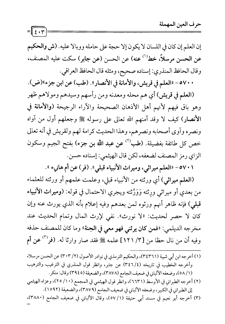 5705 - "العمائم تيجان العرب؛ والاحتباء حيطانها، وجلوس المؤمن في المسجد رباطه". القضاعي (فر) عن علي (صح) ".