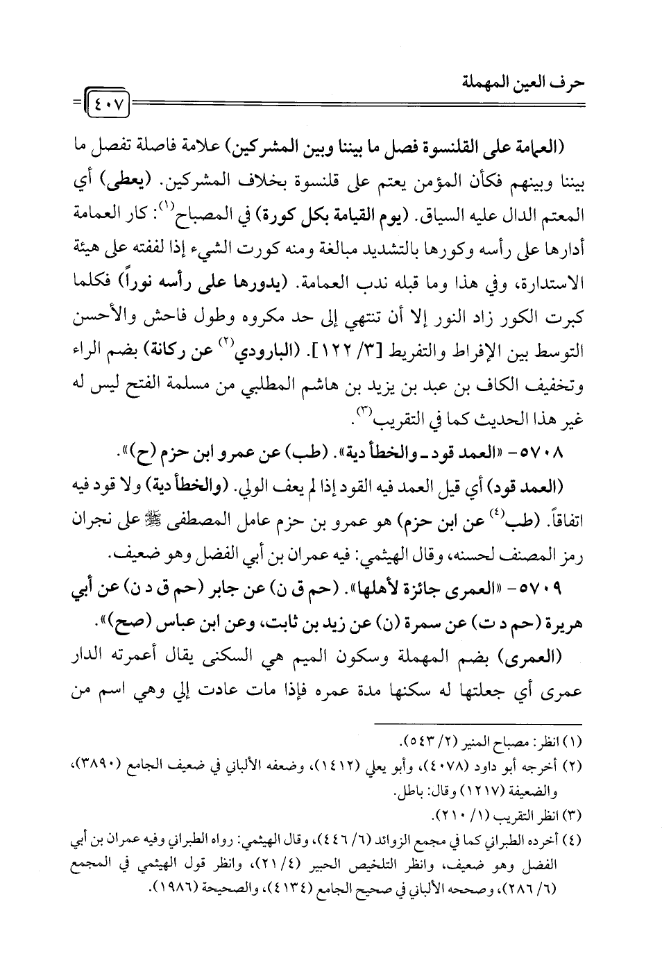 (العمرى جائزة لمن أعمرها) بالبناء للمجهول قال القاضي: إنها جائزة بالاتفاق تملك بالقبض كسائر الهبات وتورث عنه كسائر أمواله سواء أطلق أو أردفه بأنه لعقبه وورثته بعده هذا على الأصح دليلاً والأكثر قولاً. (والرقبى جائزة لمن أرقبها والعائد في هبته) التي منها العمرى والرقبى. (كالعائد في قيئه) وهذا من أدلة ملكها للموهوب له فإنَّه لا يحل العودة في القيء فكذلك في الهبة. (حم ن (¬2) عن ابن عباس) رمز المصنف لصحته.