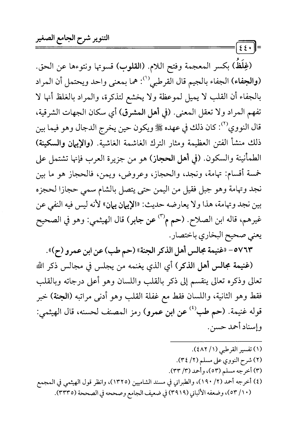 (غَيْرتان) بفتح المعجمة تثنية غيرة وهي الحمية والأنفة (إحداهما يحبها الله) أي يحب من اتصف بها لا أنه يحبها لذاتها. (والأخرى يبغضها الله تعالى) كذلك. (ومخيَلَتان) تثنية مخيلة وهي الخيلاء (أحدهما يحبها الله) ويثيب على فعلها ويحمد فاعلها. (والأخرى يبغضها الله) وهذا لف للأمور الأربعة والتركيب كله من التوسيع. (الغيرة في الريبة يحبها الله) قال ابن حجر: هذا الحديث ضابط الغيرة التي يلام صاحبها والتي لا يلام فيها قال وهذا التفضيل يتمحض في حق الرجال لضرورة اجتماع زوجين لمرأة بطريق الحل وأما المرأة فحيث غارت من زوجها في ارتكاب محرم كزنا أو نقص حق وجور عليها لضرة وتحققت ذلك أو ظهرت القرائن فيه فهي غيرة مشروعة فلو وقع بمجرد توهم من غير ريبة فهي الغيرة في غير الريبة وأما إذا كان الزوج مقسطاً عدلاً وافياً نحو كل من زوجتيه فالغيرة إن كانت لما في الطباع البشرية التي لا يسلم منها أحد من النساء فتعذر فيها ما لم تتجاوز إلى ما حرم عليها من قول أو فعل وعليه يحمل ما جاء عن السلف الصالح (¬1) من ذلك كعائشة وزينب رضي الله عنهما وقد عرف معنى قوله: (والغيرة في غير ريبة يبغضها الله، والمَخْيَلةُ إذا تصدق الرجلُ يحبها الله) لأن الإنسان يجد رائحة السخاء فيعطيها طيبة بها نفسه ولا يستكثر كثيراً ولا يعطي شيئاً إلا وهو مستقل له. (والمخيلة في الكبر يبغضها عَزَّ وَجَلَّ) لأنه يبغض الكبر كله. (حم طب ك (¬2) عن عقبة بن عامر) رمز