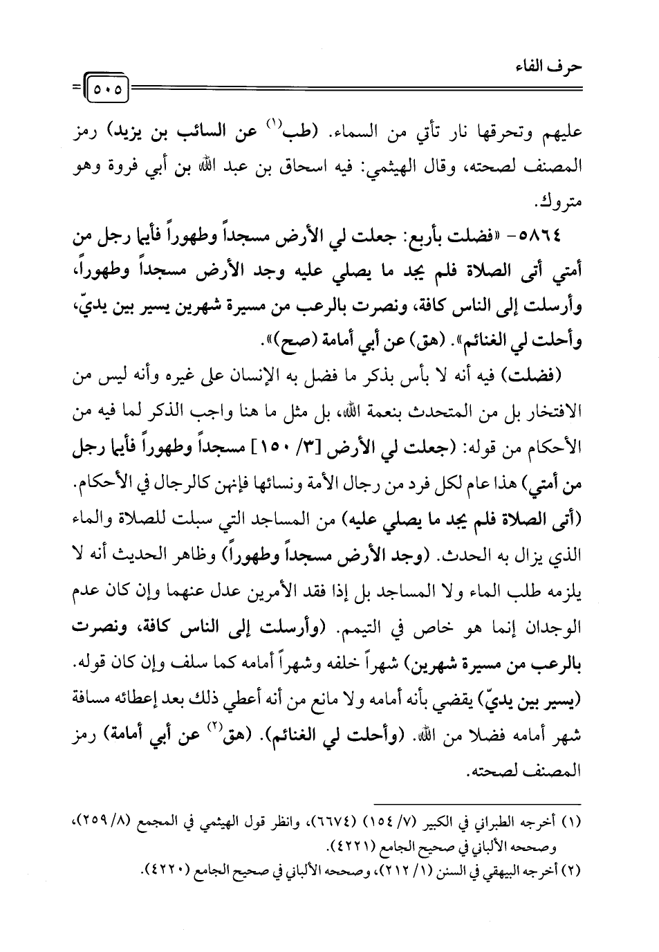 5864 - "فضلت بأربع: جعلت لي الأرض مسجداً وطهوراً فأيما رجل من أمتي أتى الصلاة فلم يجد ما يصلي عليه وجد الأرض مسجداً وطهوراً، وأرسلت إلى الناس كافة، ونصرت بالرعب من مسيرة شهرين يسير بين يديّ، وأحلت لي الغنائم". (هق) عن أبي أمامة (صح) ".