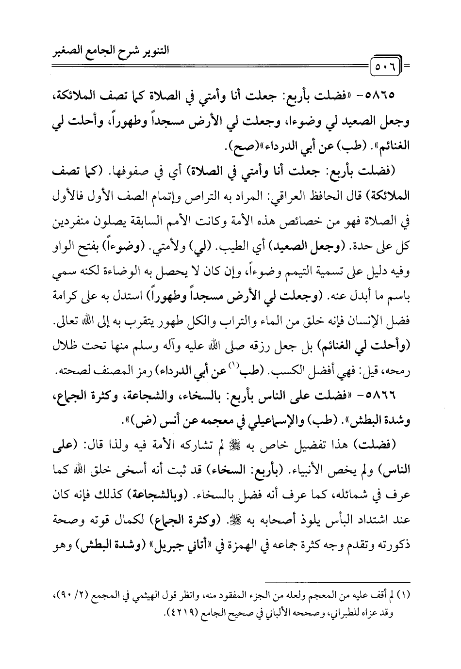 5865 - "فضلت بأربع: جعلت أنا وأمتي في الصلاة كما تصف الملائكة، وجعل الصعيد لي وضوءا، وجعلت لي الأرض مسجداً وطهوراً، وأحلت لي الغنائم". (طب) عن أبي الدرداء" (صح).