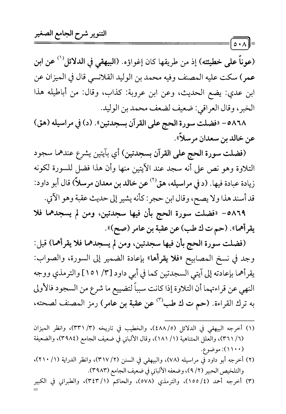5868 - "فضلت سورة الحج على القرآن بسجدتين". (د) في مراسيله (هق) عن خالد بن سعدان مرسلاً".