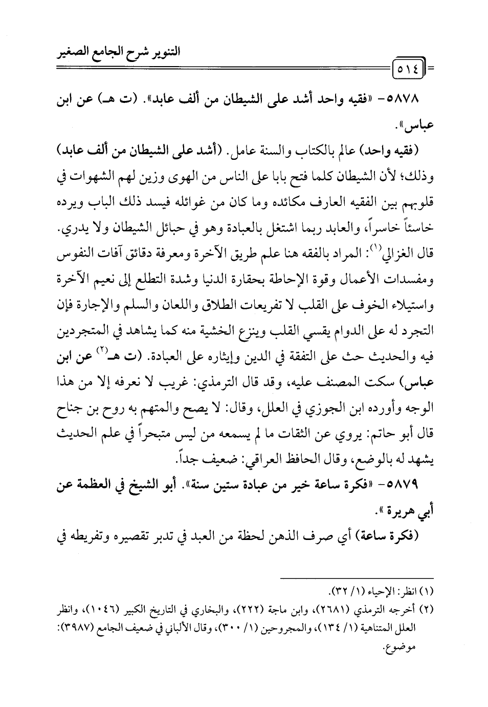 5878 - "فقيه واحد أشد على الشيطان من ألف عابد". (ت هـ) عن ابن عباس".