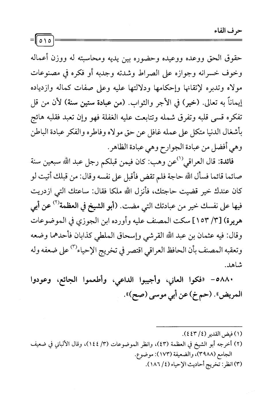 فائدة: قال العراقي (¬1) عن وهب: كان فيمن قبلكم رجل عبد الله سبعين سنة صائما قائما فسأل الله حاجة فلم تقض فأقبل على نفسه وقال: من قبلك أتيت لو كان عندك خير قضيت حاجتك، فأنزل الله ملكا فقال: ساعتك التي ازدريت فيها على نفسك خير من عبادتك التي مضت. (أبو الشيخ في العظمة (¬2) عن أبي هريرة) [3/ 153] سكت المصنف عليه وأورده ابن الجوزي في الموضوعات وقال: فيه عثمان بن عبد الله القرشي وإسحاق الملطي كذابان فأحدهما وضعه وتعقبه المصنف بأن الحافظ العراقي اقتصر في تخريج الإحياء (¬3) على ضعفه وله شاهد.