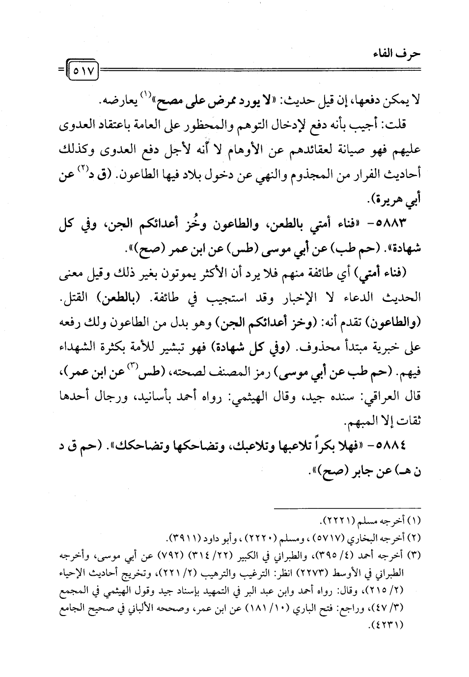 5883 - "فناء أمتي بالطعن، والطاعون وخُز أعدائكم الجن، وفي كل شهادة". (حم طب) عن أبي موسى (طس) عن ابن عمر (صح) ".