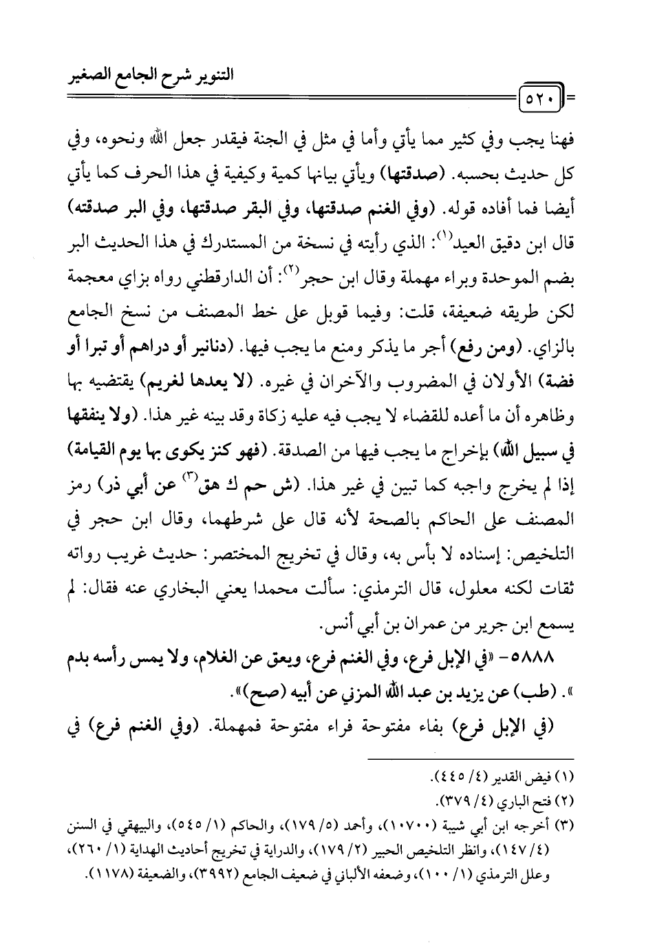 فهنا يجب وفي كثير مما يأتي وأما في مثل في الجنة فيقدر جعل الله ونحوه، وفي كل حديث بحسبه. (صدقتها) ويأتي بيانها كمية وكيفية في هذا الحرف كما يأتي أيضاً فما أفاده قوله. (وفي الغنم صدقتها، وفي البقر صدقتها، وفي البر صدقته) قال ابن دقيق العيد (¬1): الذي رأيته في نسخة من المستدرك في هذا الحديث البر بضم الموحدة وبراء مهملة وقال ابن حجر (¬2): أن الدارقطني رواه بزاي معجمة لكن طريقه ضعيفة، قلت: وفيما قوبل على خط المصنف من نسخ الجامع بالزاي. (ومن رفع) أجر ما يذكر ومنع ما يجب فيها. (دنانير أو دراهم أو تبرا أو فضة) الأولان في المضروب والآخران في غيره. (لا يعدها لغريم) يقتضيه بها وظاهره أن ما أعده للقضاء لا يجب فيه عليه زكاة وقد بينه غير هذا. (ولا ينفقها في سبيل الله) بإخراج ما يجب فيها من الصدقة. (فهو كنز يكوى بها يوم القيامة) إذا لم يخرج واجبه كما تبين في غير هذا. (ش حم ك هق (¬3) عن أبي ذر) رمز المصنف على الحاكم بالصحة لأنه قال على شرطهما، وقال ابن حجر في التلخيص: إسناده لا بأس به، وقال في تخريج المختصر: حديث غريب رواته ثقات لكنه معلول، قال الترمذي: سألت محمدا يعني البخاري عنه فقال: لم يسمع ابن جرير من عمران بن أبي أنس.