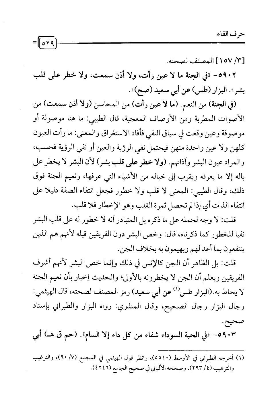 5902 - "في الجنة ما لا عين رأت ولا أذن سمعت، ولا خطر على قلب بشر". البزار (طس) عن أبي سعيد (صح) ".