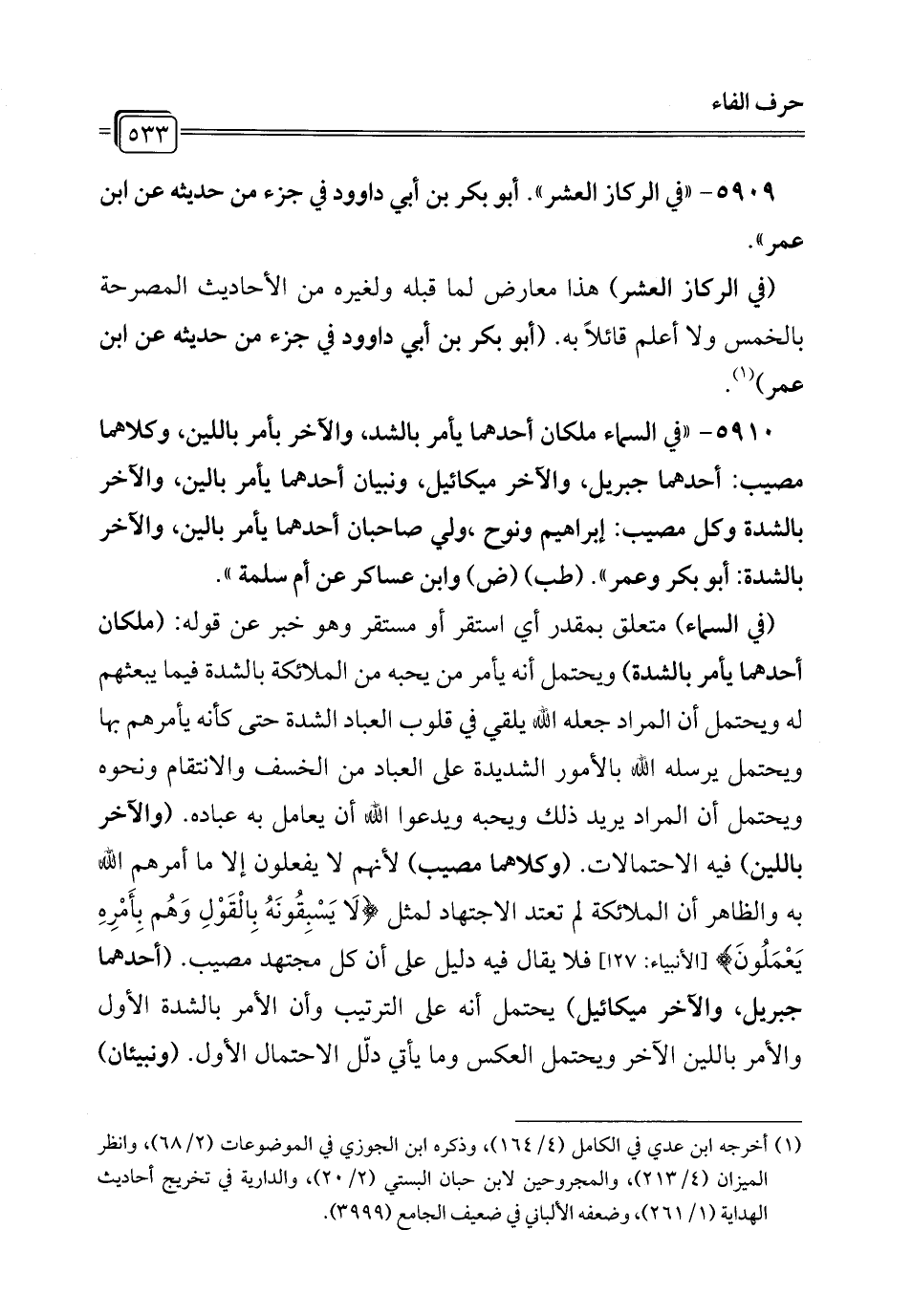 (في السماء) متعلق بمقدر أي استقر أو مستقر وهو خبر عن قوله: (ملكان أحدهما يأمر بالشدة) ويحتمل أنه يأمر من يحبه من الملائكة بالشدة فيما يبعثهم له ويحتمل أن المراد جعله الله يلقي في قلوب العباد الشدة حتى كأنه يأمرهم بها ويحتمل يرسله الله بالأمور الشديدة على العباد من الخسف والانتقام ونحوه ويحتمل أن المراد يريد ذلك ويحبه ويدعوا الله أن يعامل به عباده. (والآخر باللين) فيه الاحتمالات. (وكلاهما مصيب) لأنهم لا يفعلون إلا ما أمرهم الله به والظاهر أن الملائكة لم تعتد الاجتهاد لمثل {لَا يَسْبِقُونَهُ بِالْقَوْلِ وَهُمْ بِأَمْرِهِ يَعْمَلُونَ (27)} [الأنبياء: 27] فلا يقال فيه دليل على أن كل مجتهد مصيب. (أحدهما جبريل، والآخر ميكائيل) يحتمل أنه على الترتيب وأن الأمر بالشدة الأول والأمر باللين الآخر ويحتمل العكس وما يأتي دلّل الاحتمال الأول. (ونبيئان)