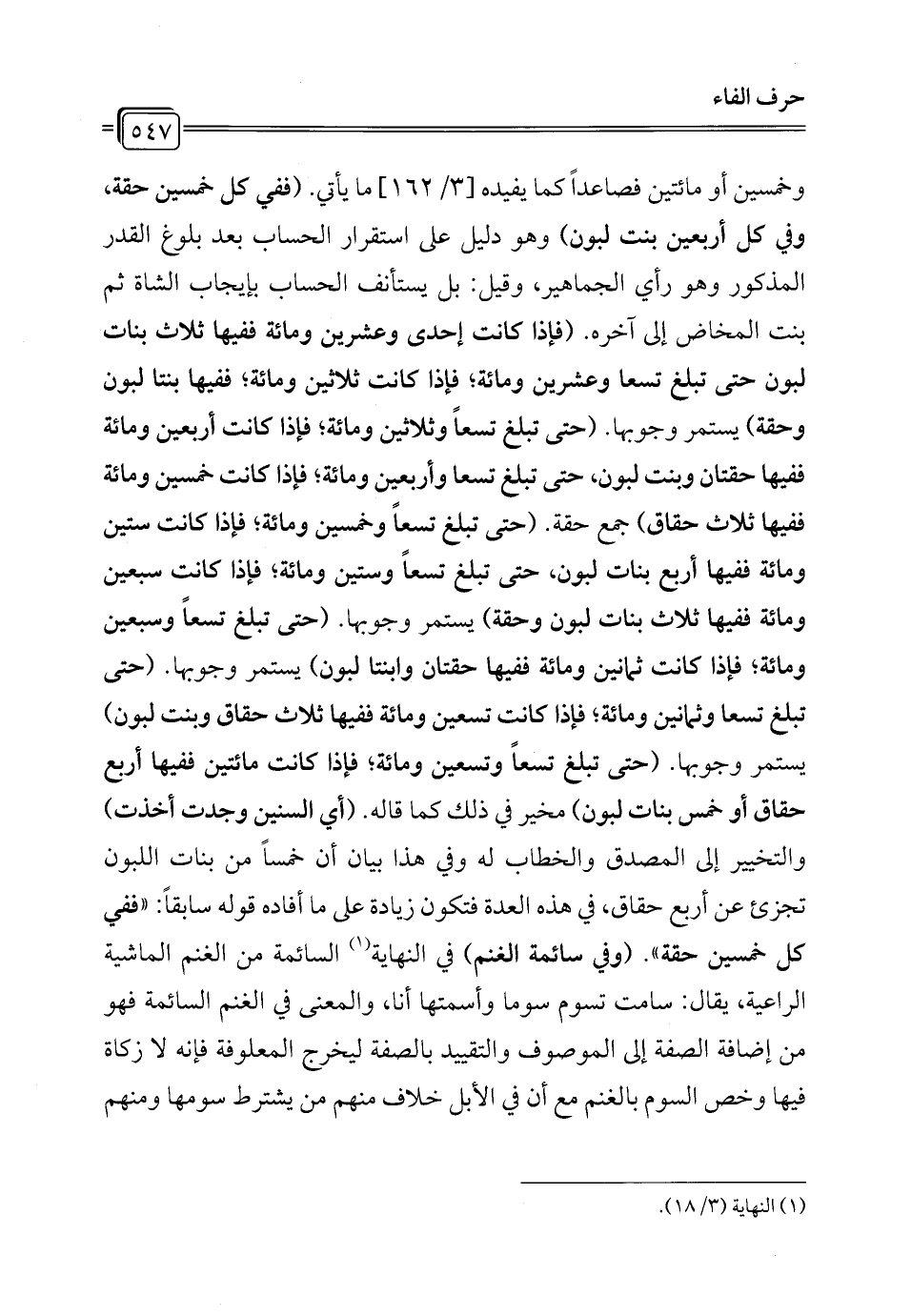 وخمسين أو مائتين فصاعداً كما يفيده [3/ 162] ما يأتي. (ففي كل خمسين حقة، وفي كل أربعين بنت لبون) وهو دليل على استقرار الحساب بعد بلوغ القدر المذكور وهو رأي الجماهير، وقيل: بل يستأنف الحساب بإيجاب الشاة ثم بنت المخاض إلى آخره. (فإذا كانت إحدى وعشرين ومائة ففيها ثلاث بنات لبون حتى تبلغ تسعا وعشرين ومائة؛ فإذا كانت ثلاثين ومائة؛ ففيها بنتا لبون وحقة) يستمر وجوبها. (حتى تبلغ تسعاً وثلاثين ومائة؛ فإذا كانت أربعين ومائة ففيها حقتان وبنت لبون، حتى تبلغ تسعا وأربعين ومائة؛ فإذا كانت خمسين ومائة ففيها ثلاث حقاق) جمع حقة. (حتى تبلغ تسعاً وخمسين ومائة؛ فإذا كانت ستين ومائة ففيها أربع بنات لبون، حتى تبلغ تسعاً وستين ومائة؛ فإذا كانت سبعين ومائة ففيها ثلاث بنات لبون وحقة) يستمر وجوبها. (حتى تبلغ تسعاً وسبعين ومائة؛ فإذا كانت ثمانين ومائة ففيها حقتان وابنتا لبون) يستمر وجوبها. (حتى تبلغ تسعاً وثمانين ومائة؛ فإذا كانت تسعين ومائة ففيها ثلاث حقاق وبنت لبون) يستمر وجوبها. (حتى تبلغ تسعاً وتسعين ومائة؛ فإذا كانت مائتين ففيها أربع حقاق أو خمس بنات لبون) مخير في ذلك كما قاله. (أي السنين وجدت أخذت) والتخيير إلى المصدق والخطاب له وفي هذا بيان أن خمساً من بنات اللبون تجزئ عن أربع حقاق، في هذه العدة فتكون زيادة على ما أفاده قوله سابقاً: "ففي كل خمسين حقة". (وفي سائمة الغنم) في النهاية (¬1) السائمة من الغنم الماشية الراعية، يقال: سامت تسوم سوما وأسمتها أنا، والمعنى في الغنم السائمة فهو من إضافة الصفة إلى الموصوف والتقييد بالصفة ليخرج المعلوفة فإنه لا زكاة فيها وخص السوم بالغنم مع أن في الإبل خلاف منهم من يشترط سومها ومنهم