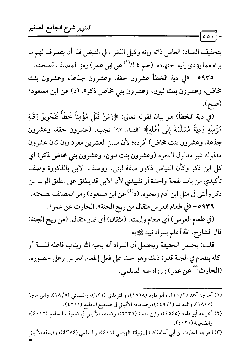 5935 - "في دية الخطأ عشرون حقة، وعشرون جذعة، وعشرون بنت مخاض، وعشرون بنت لبون، وعشرون بني مخاض ذكر". (د) عن ابن مسعود" (صح).