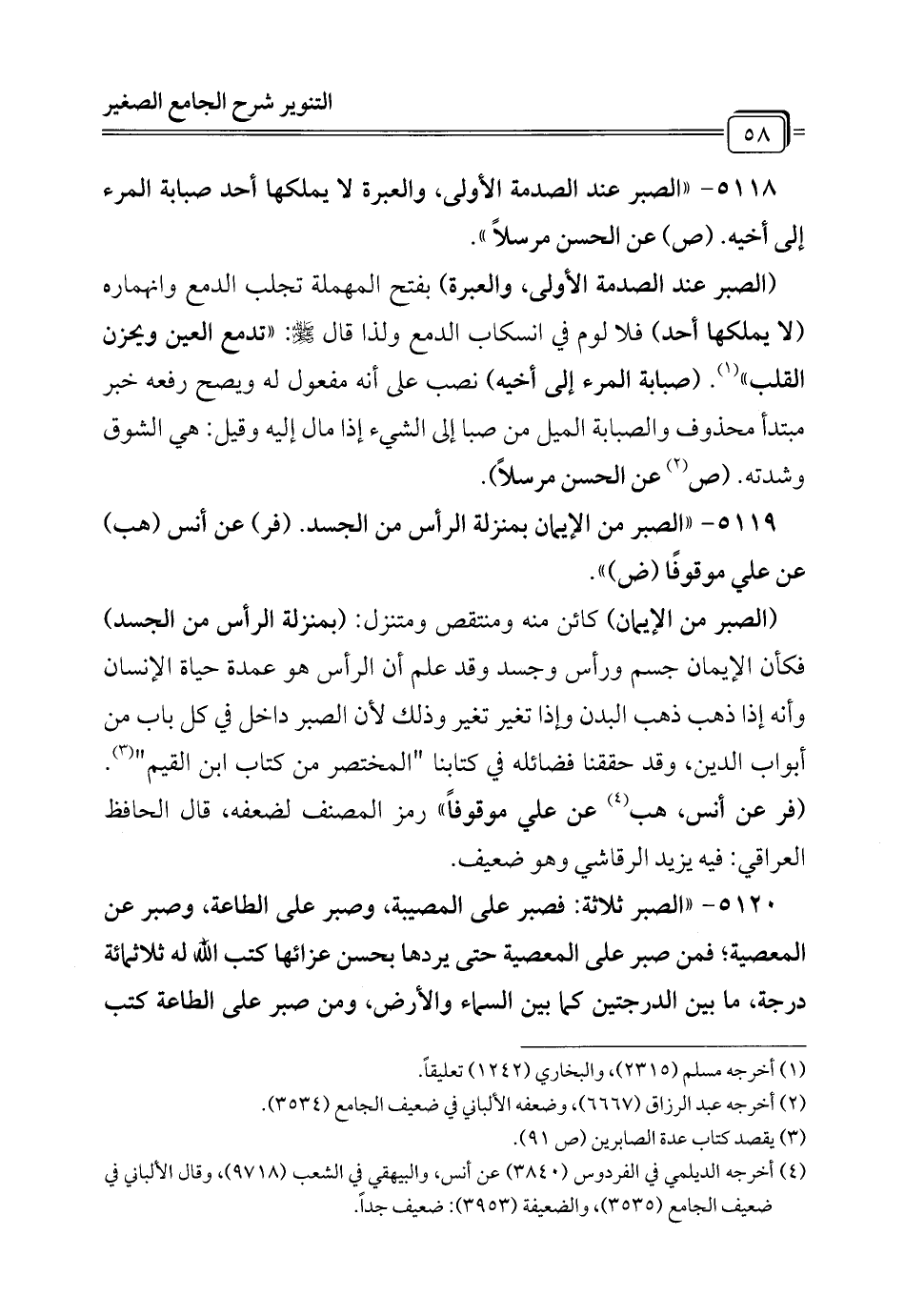 5119 - "الصبر من الإيمان بمنزلة الرأس من الجسد. (فر) عن أنس (هب) عن علي موقوفًا (ض) ".