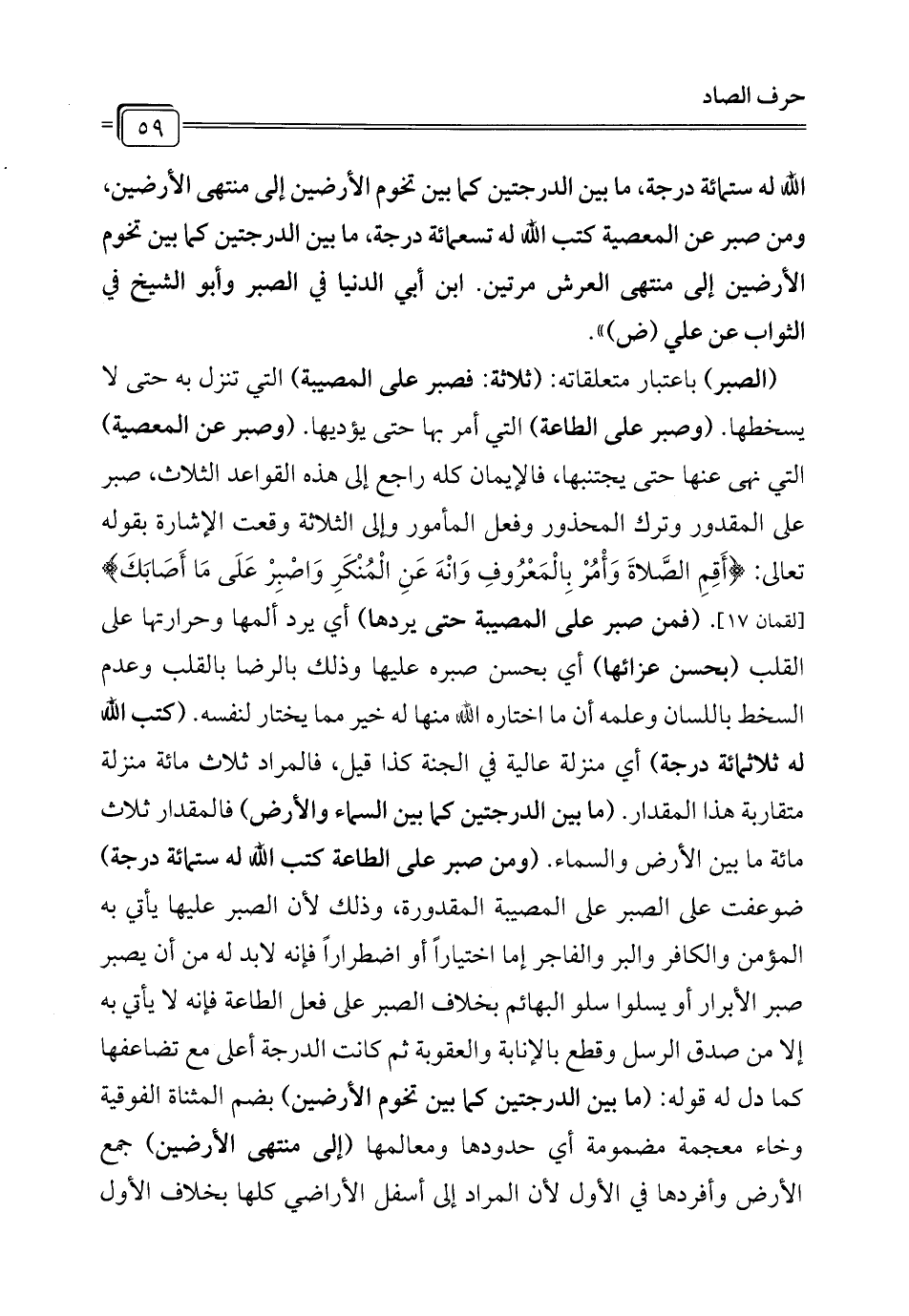 الله له ستمائة درجة، ما بين الدرجتين كما بين تخوم الأرضين إلى منتهى الأرضين، ومن صبر عن المعصية كتب الله له تسعمائة درجة، ما بين الدرجتين كما بين تخوم الأرضين إلى منتهى العرش مرتين. ابن أبي الدنيا في الصبر وأبو الشيخ في الثواب عن علي (ض) ".