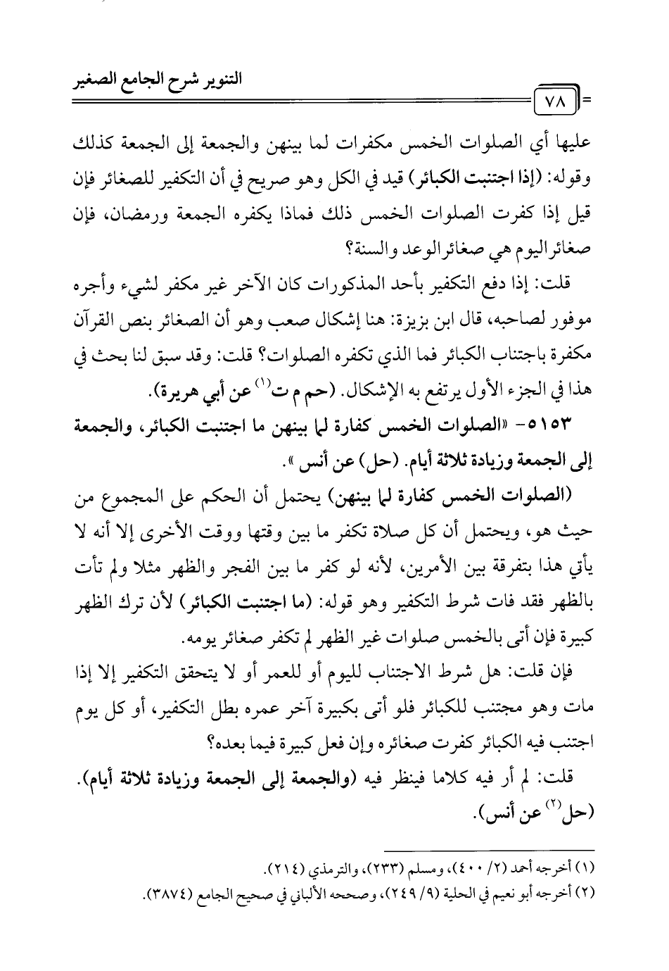 5153 - "الصلوات الخمس كفارة لما بينهن ما اجتنبت الكبائر، والجمعة إلى الجمعة وزيادة ثلاثة أيام. (حل) عن أنس".
