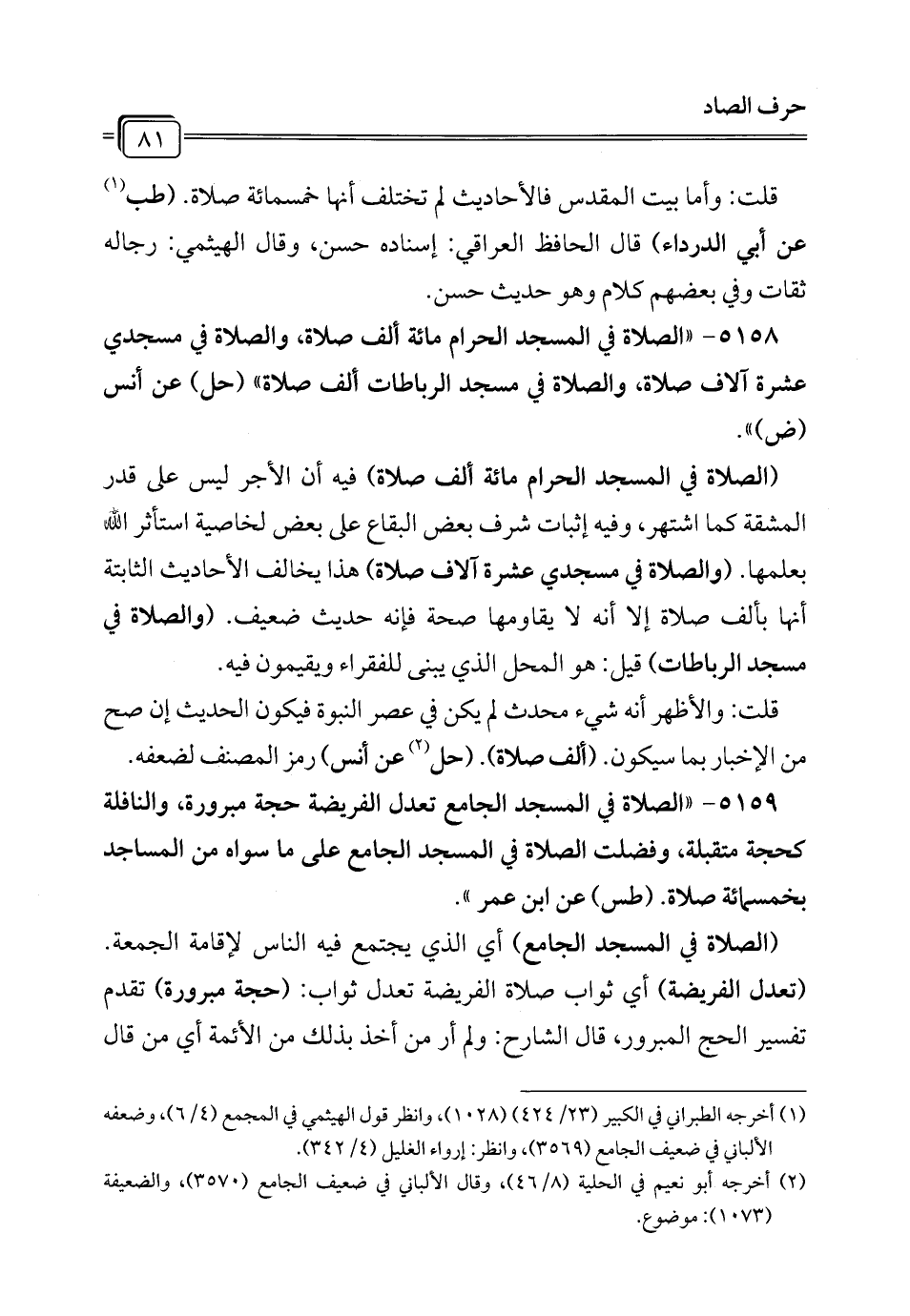 5158 - "الصلاة في المسجد الحرام مائة ألف صلاة، والصلاة في مسجدي عشرة آلاف صلاة، والصلاة في مسجد الرباطات ألف صلاة" (حل) عن أنس (ض) ".