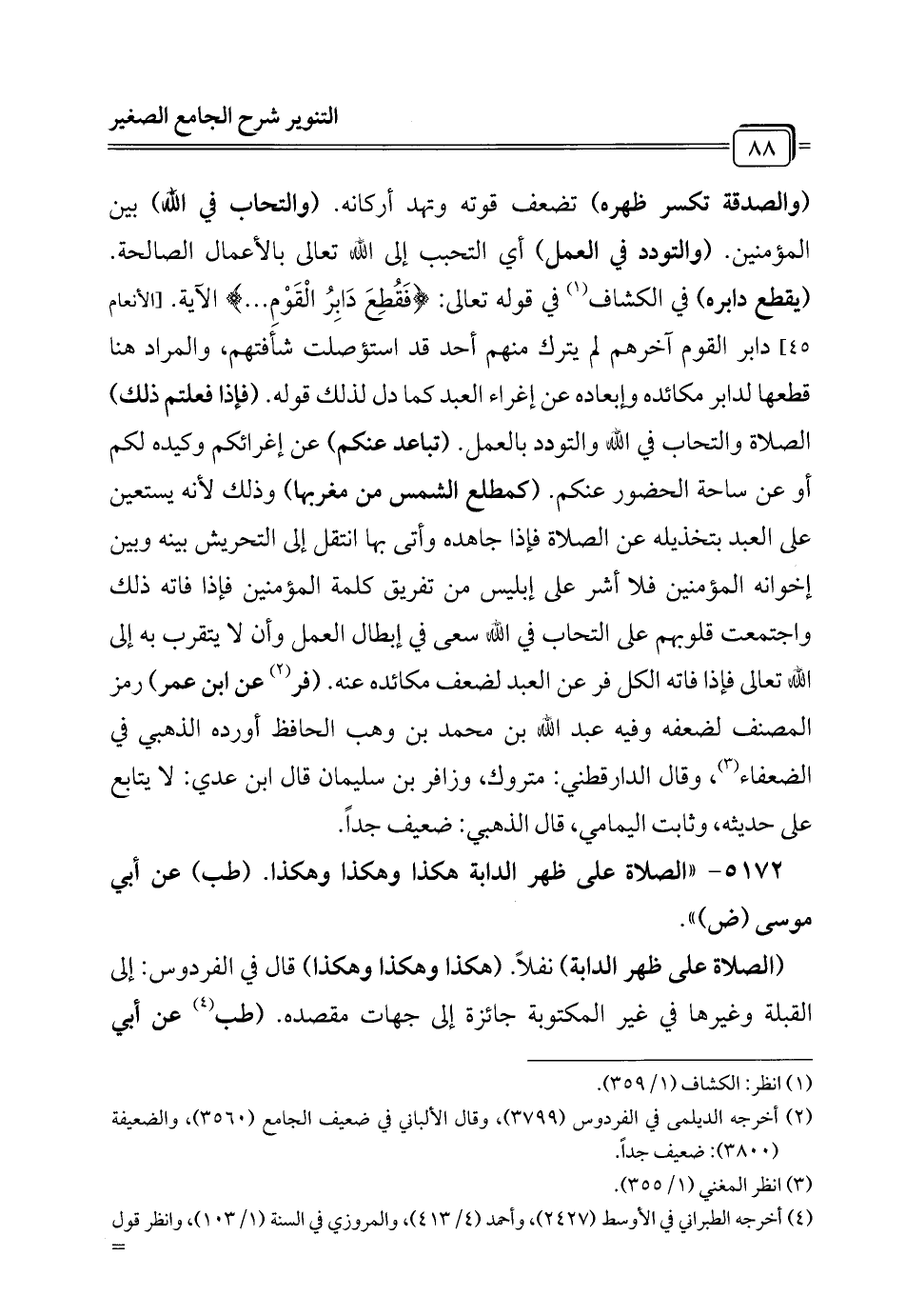 (والصدقة تكسر ظهره) تضعف قوته وتهد أركانه. (والتحاب في الله) بين المؤمنين. (والتودد في العمل) أي التحبب إلى الله تعالى بالأعمال الصالحة. (يقطع دابره) في الكشاف (¬1) في قوله تعالى: {فَقُطِعَ دَابِرُ الْقَوْمِ} [الأنعام: 45]، دابر القوم آخرهم لم يترك منهم أحد قد استؤصلت شأفتهم، والمراد هنا قطعها لدابر مكائده وإبعاده عن إغراء العبد كما دل لذلك قوله. (فإذا فعلتم ذلك) الصلاة والتحاب في الله والتودد بالعمل. (تباعد عنكم) عن إغرائكم وكيده لكم أو عن ساحة الحضور عنكم. (كمطلع الشمس من مغربها) وذلك لأنه يستعين على العبد بتخذيله عن الصلاة فإذا جاهده وأتى بها انتقل إلى التحريش بينه وبين إخوانه المؤمنين فلا أشر على إبليس من تفريق كلمة المؤمنين فإذا فاته ذلك واجبحت قلوبهم على التحاب في الله سعى في إبطال العمل وأن لا يتقرب به إلى الله تعالى فإذا فاته الكل فر عن العبد لضعف مكائده عنه. (فر (¬2) عن ابن عمر) رمز المصنف لضعفه وفيه عبد الله بن محمد بن وهب الحافظ أورده الذهبي في الضعفاء (¬3)، وقال الدارقطني: متروك، وزافر بن سليمان قال ابن عدي: لا يتابع على حديثه، وثابت اليمامي، قال الذهبي: ضعيف جداً.