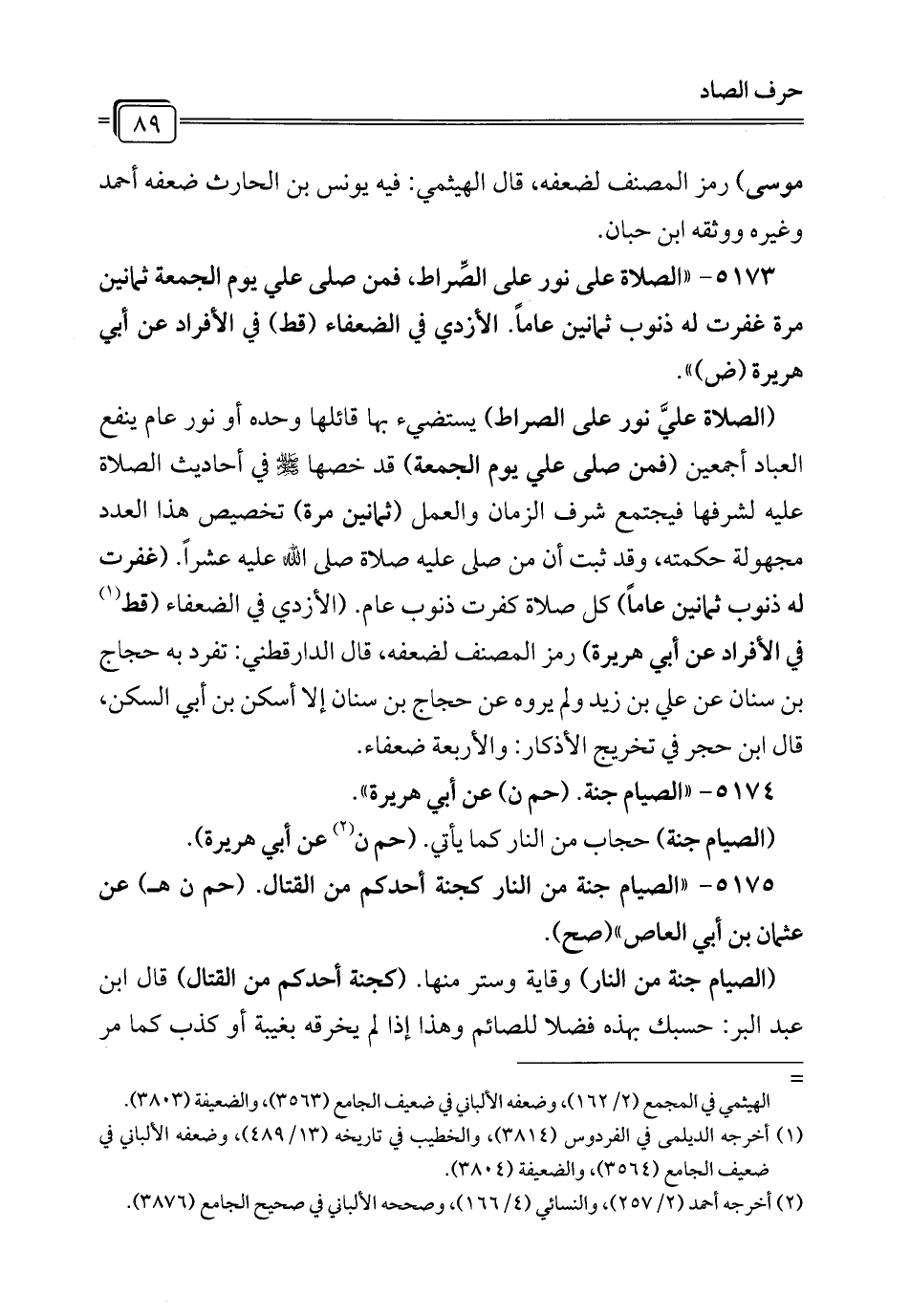 5173 - "الصلاة على نور على الصِّراط، فمن صلى علي يوم الجمعة ثمانين مرة غفرت له ذنوب ثمانين عاماً. الأزدي في الضعفاء (قط) في الأفراد عن أبي هريرة (ض) ".