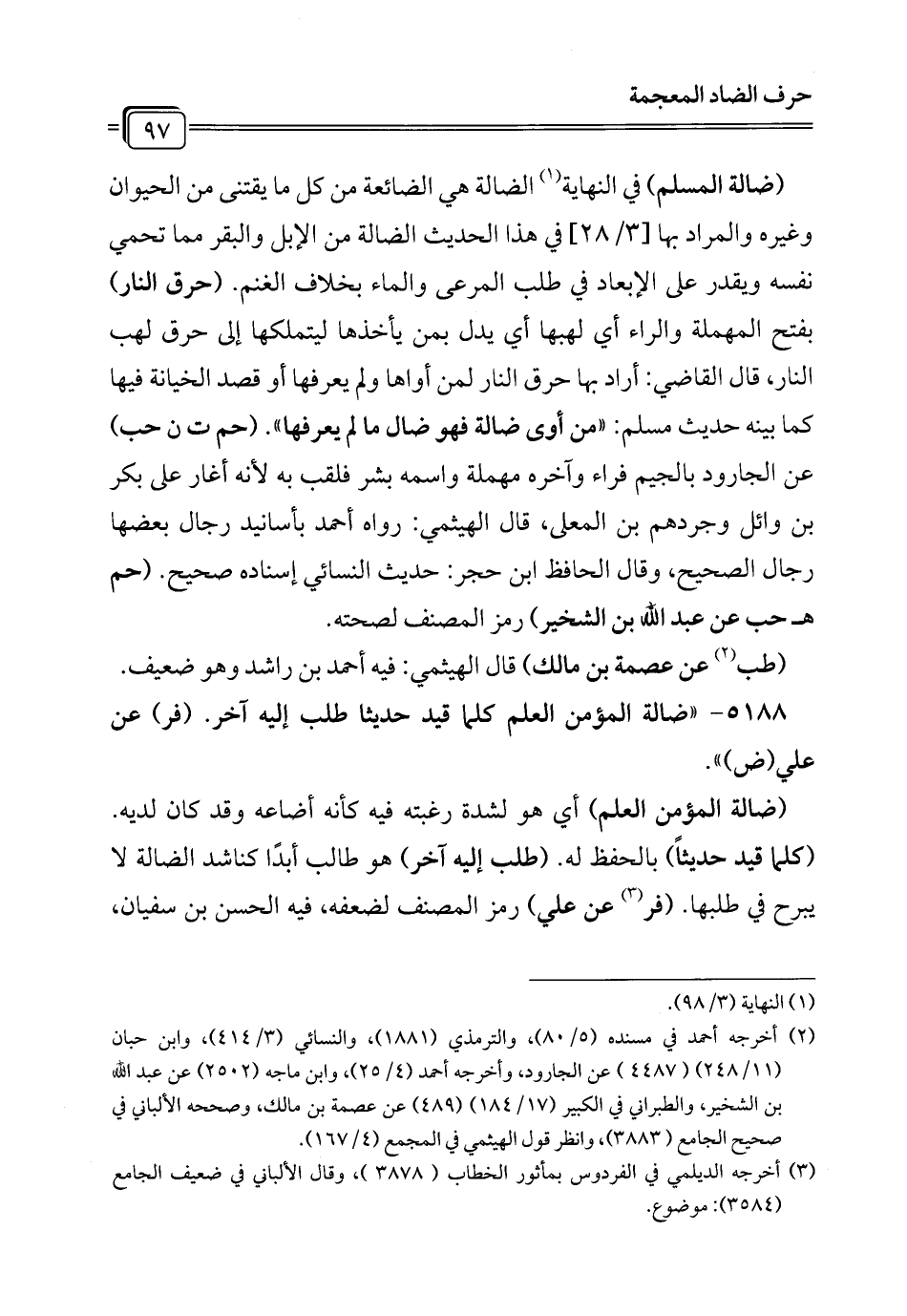 (ضالة المسلم) في النهاية (¬1) الضالة هي الضائعة من كل ما يقتنى من الحيوان وغيره والمراد بها [3/ 28] في هذا الحديث الضالة من الإبل والبقر مما تحمي نفسه ويقدر على الإبعاد في طلب المرعى والماء بخلاف الغنم. (حرق النار) بفتح المهملة والراء أي لهبها أي يدل بمن يأخذها ليتملكها إلى حرق لهب النار، قال القاضي: أراد بها حرق النار لمن أواها ولم يعرفها أو قصد الخيانة فيها كما بينه حديث مسلم: "من أوى ضالة فهو ضال ما لم يعرفها". (حم ت ن حب) عن الجارود بالجيم فراء وآخره مهملة واسمه بشر فلقب به لأنه أغار على بكر بن وائل وجردهم بن المعلى، قال الهيثمي: رواه أحمد بأسانيد رجال بعضها رجال الصحيح، وقال الحافظ ابن حجر: حديث النسائي إسناده صحيح. (حم هـ حب عن عبد الله بن الشخير) رمز المصنف لصحته.