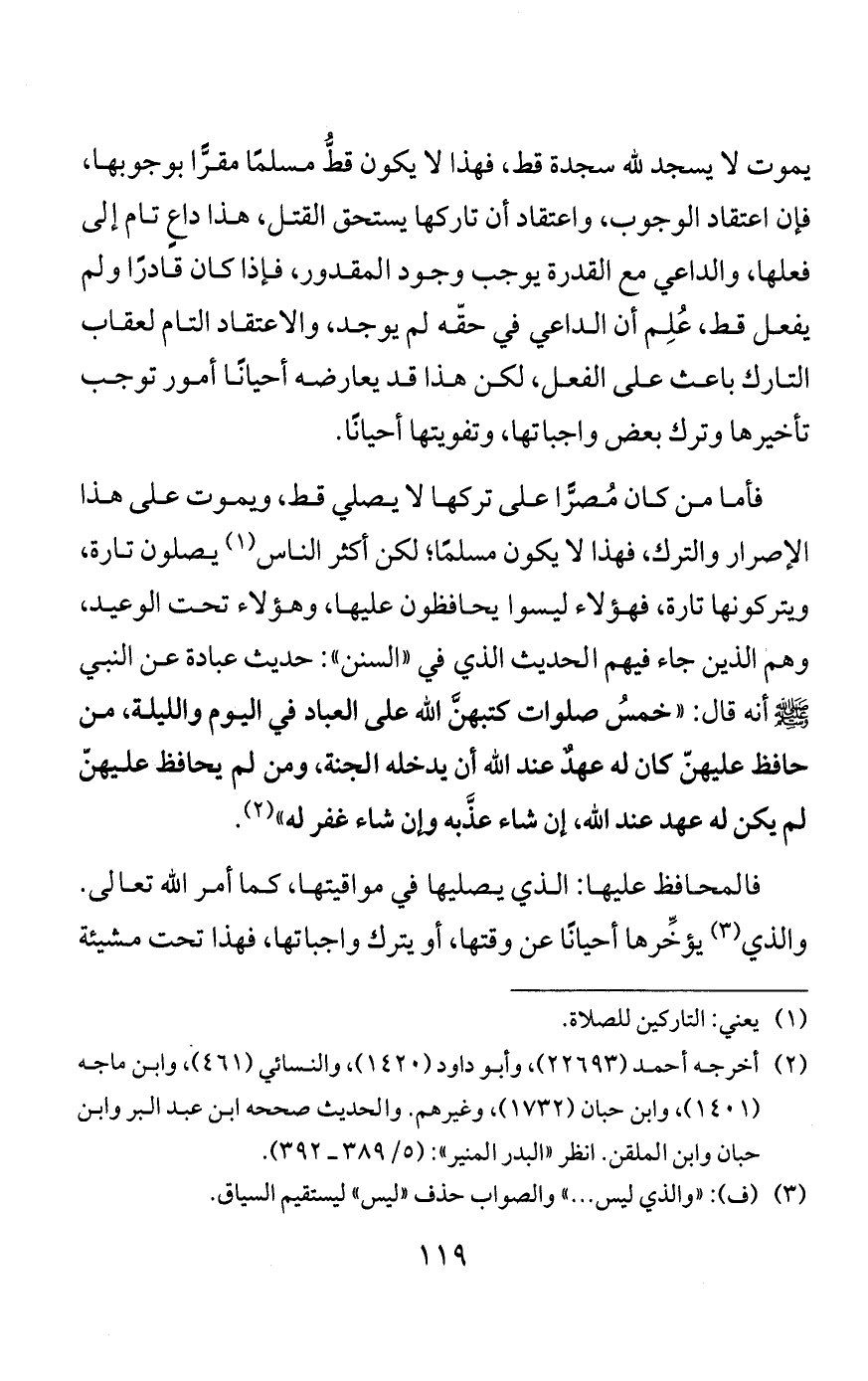 وهذه الفروع لم تنقل عن الصحابة، وهي فروع فاسدة، فإن كان مقرًّا بالصلاة في الباطن، معتقدًا لوجوبها، يمتنع أن يصرَّ على تركها