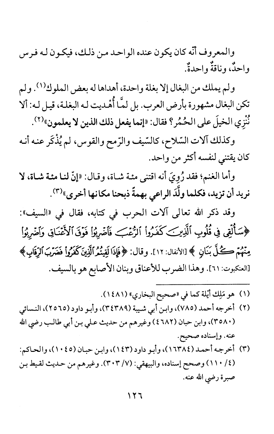وكان يركب الخيل والإبل والحمير، وركب البغلة أيضًا، وكان يركب الفرس تارة عُرْيًا، وتارة مُسْرَجًا، ويطرده، وكان يُرْدِف خلفَه، وتارة يردف خلفَة وقُدّامه، فيكونون ثلاثة على دابّة.