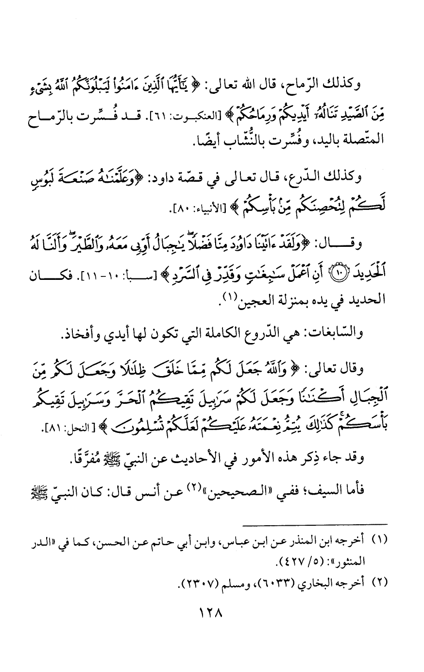 وقد ذكر الله تعالى آلات الحرب في كتابه، فقال في «السيف»: {سَأُلْقِي فِي قُلُوبِ الَّذِينَ كَفَرُوا الرُّعْبَ فَاضْرِبُوا فَوْقَ الْأَعْنَاقِ وَاضْرِبُوا مِنْهُمْ كُلَّ بَنَانٍ} [الأنفال: 12]. وقال: {فَإِذَا لَقِيتُمُ الَّذِينَ كَفَرُوا فَضَرْبَ الرِّقَابِ} [العنكبوت: 61]. وهذا الضرب للأعناق وبنان الأصابع هو بالسيف.