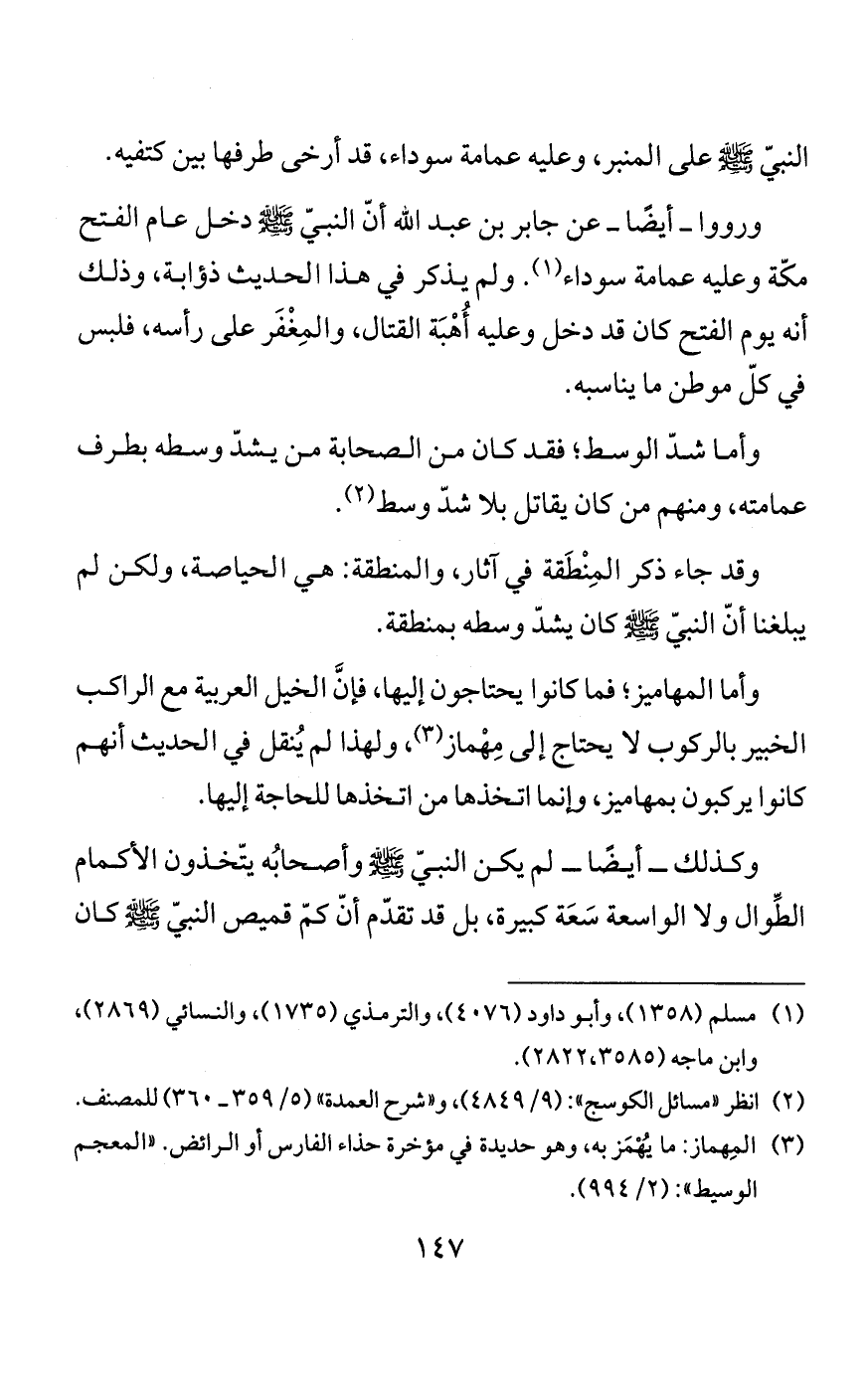 وكان أيضًا يلبس العمامة على القَلَنْسوة، وكذلك أصحابه، وكانوا مع ذلك يركبون الخيل ويطردونها، ويقاتلون في سبيل الله، ولهذا كانوا يديرون العمائم تحت أذقانهم، ويسمّى ذلك: التَّلَحِّي.