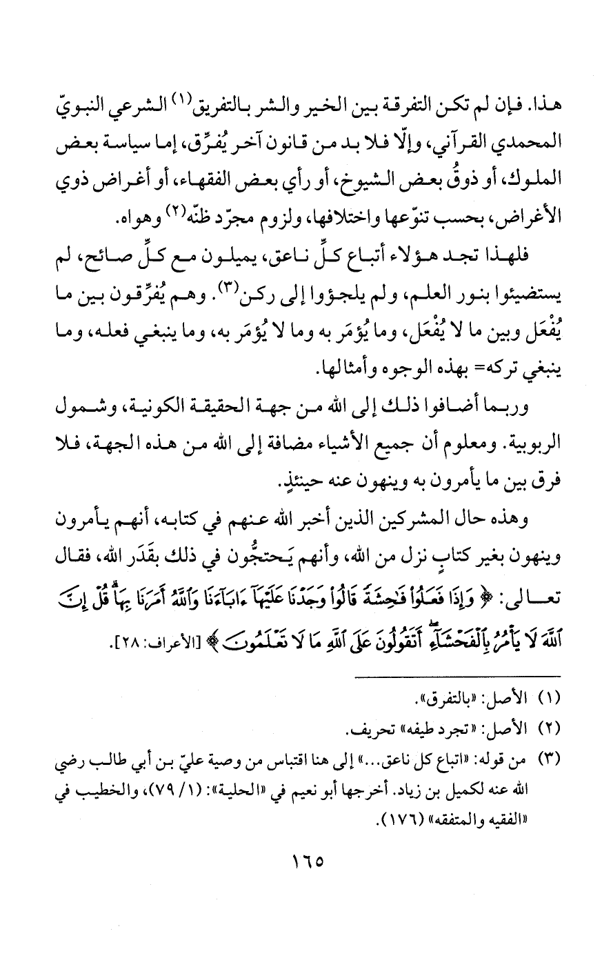 هو أعلى المقامات، ويَظنُّ أن مَن كان هذا المشهد مقامه يسقط عنه الأمرُ والنهي. ويقول أحدهم: إنما يسقط عنه الأمر لأنه شهد الإرادة. ولا يعلم أن مُجرَّد توحيد الربوبية قد أقرّ به المشركون، كما قال تعالى: {وَلَئِنْ سَأَلْتَهُمْ مَنْ خَلَقَ السَّمَاوَاتِ وَالْأَرْضَ وَسَخَّرَ الشَّمْسَ وَالْقَمَرَ لَيَقُولُنَّ اللَّهُ} [العنكبوت: 61].