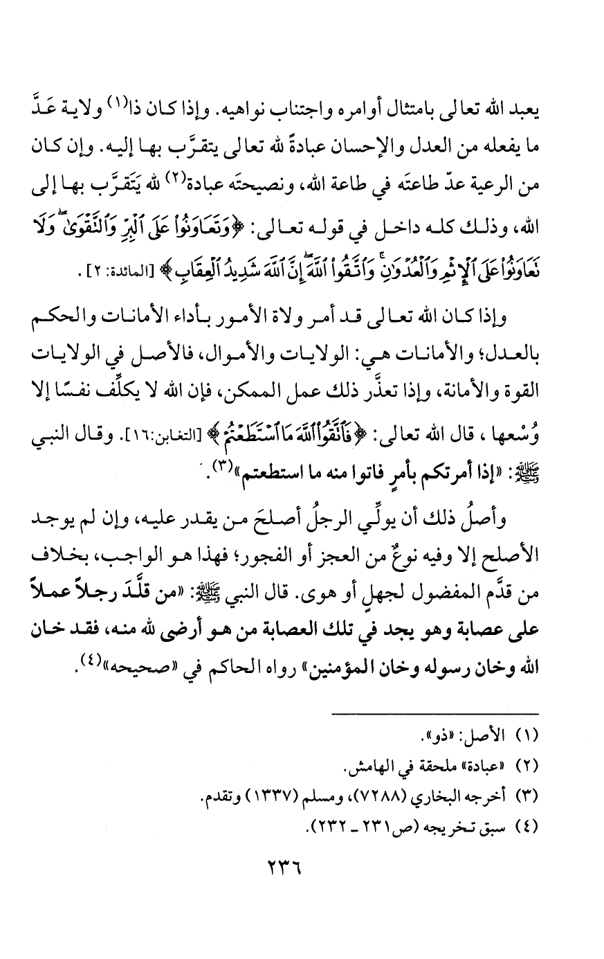 واتفق الصحابة على قتال أقوام كانوا يصلّون ويصومون شهر رمضان إذا خرجوا عن بعض شرائع الإسلام، وقد تواتر في الصحاح عن النبي صلى الله عليه وسلم أنه ذكر الخوارج فقال: «يَحْقِر أحدُكم صلاتَه مع صلاتهم، وصيامَه من صيامهم، وقراءته مع قراءتهم، يقرأون القرآن لا يجاوز حناجرهم، يمرقون من الإسلام كما يمرق السَّهم من الرَّميَّة، أينما لقيتموهم قاقتلوهم، فإن في قَتْلهم أجرًا لمن قتلهم عند الله يوم القيامة، لئن أدركتهم لأقتلنهم قتل عاد». وهؤلاء قاتلهم أمير المؤمنين علي بن أبي طالب مع الصحابة.
