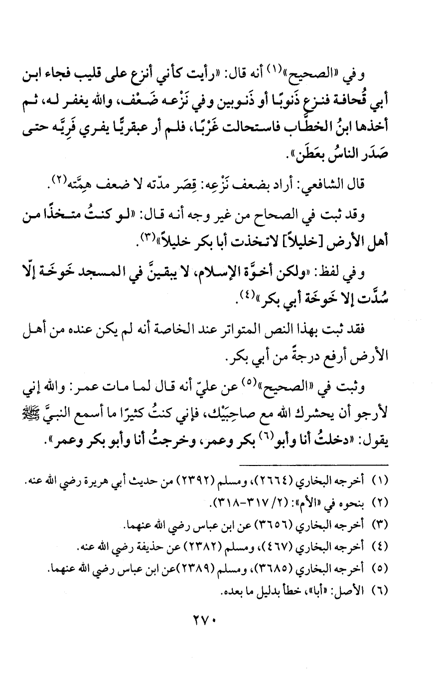 وأما خلافة أبي بكر وعمر وثبوت فضلهما على عثمان وعلي وغيرهما؛ فدلائله أكثر من أن تُحصر، فقد ثبت في «الصحيح» أن النبي صلى الله عليه وسلم قال لعائشة: «ادعي لي أباك وأخاك حتى أكتب لأبي بكر كتابًا لا يختلف عليه الناسُ من بعدي». ثم قال: «يأبى الله والمؤمنون إلا أبا بكر».