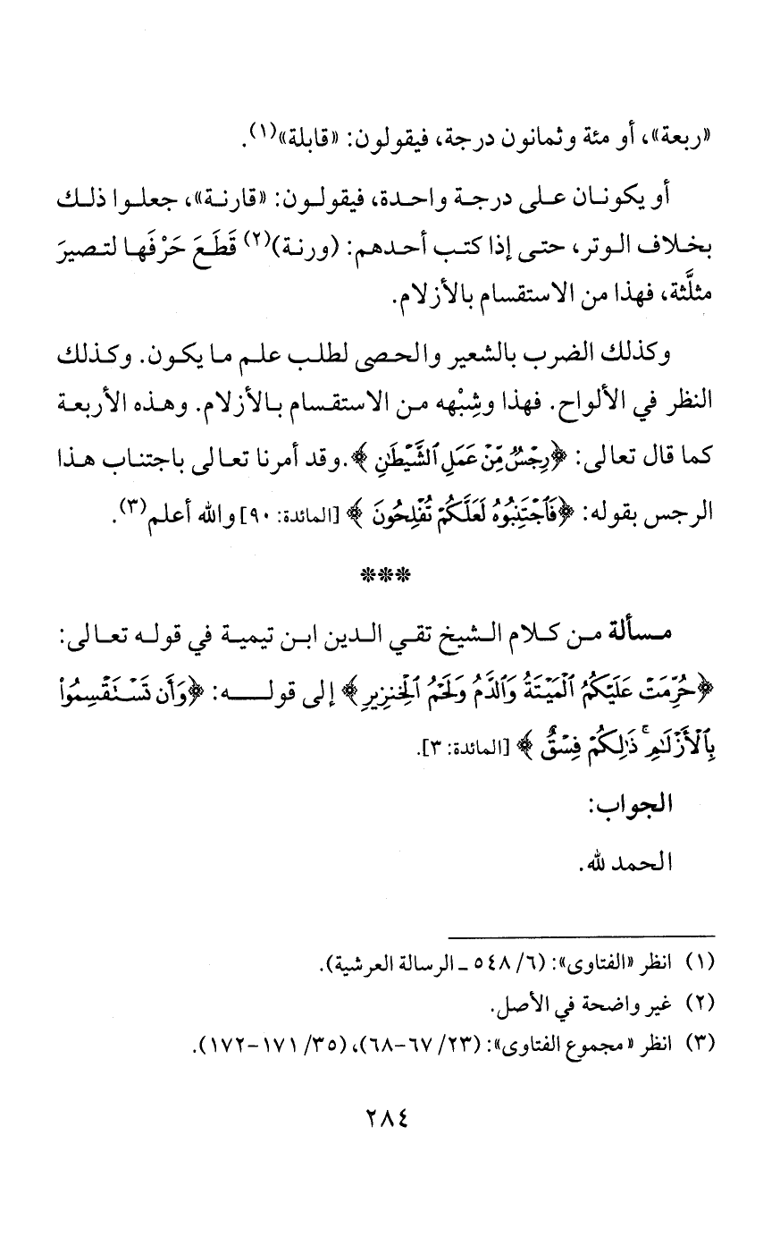 مسألة من كلام شيخ الإسلام وعلامة الزمان تقي الدين ابن تيمية الحراني في قوله تعالى: {إِنَّمَا الْخَمْرُ وَالْمَيْسِرُ وَالْأَنْصَابُ وَالْأَزْلَامُ رِجْسٌ مِنْ عَمَلِ الشَّيْطَانِ} [المائدة: 90].