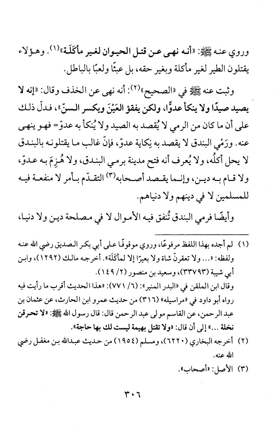 وقد ثبت عن النبي صلى الله عليه وسلم: أنه نهى أن يُتَّخَذ شيء فيه الرّوح غَرَضًا، ولعن النبيّ صلى الله عليه وسلم من يفعل ذلك، فنهى أن يُجعل الطير والبهيمة غَرَضًا يُقصَد برمي الأغراض التي تُنْصب للرمي، فإنّ ذلك تعذيب للحيوان
