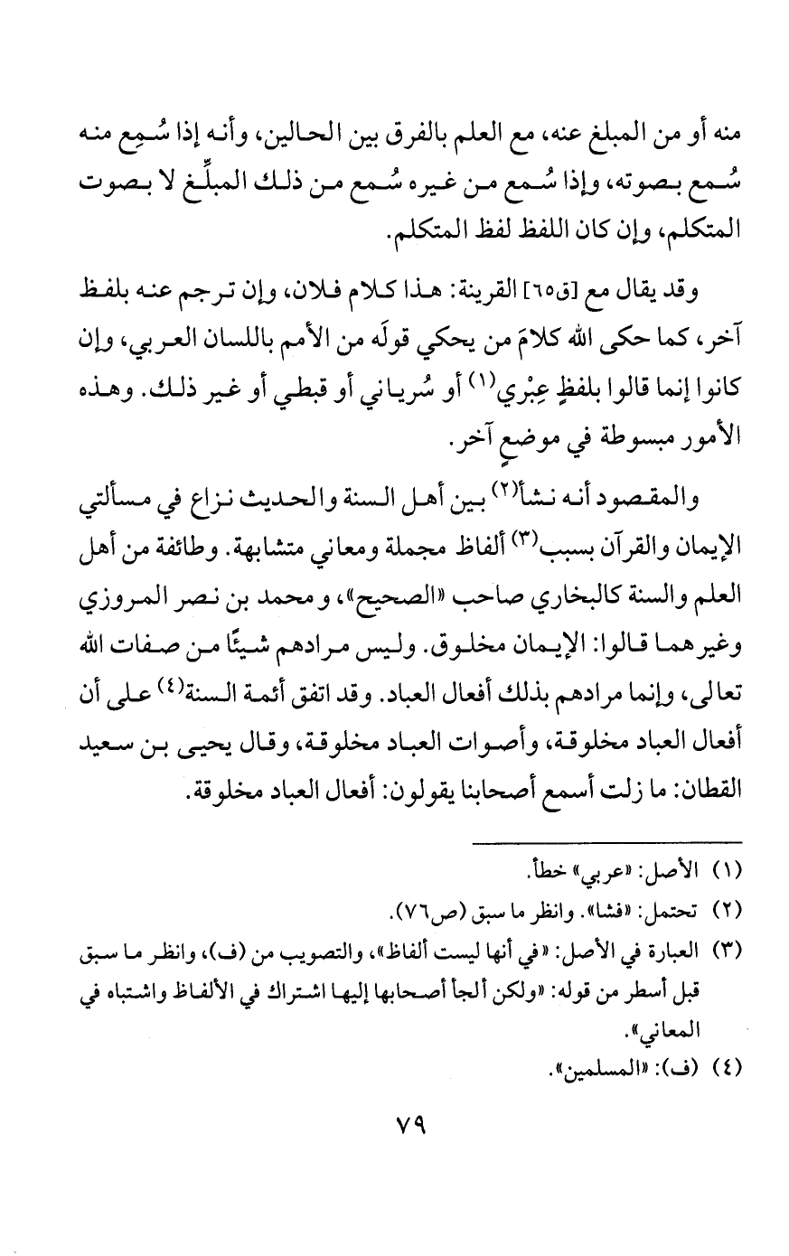 ومراده أن من قال: هي مخلوقة مطلقًا، كان مقتضى قوله أن الله لم يتكلم بهذه الكلمة، كما أن من قال: ألفاظنا وتلاوتنا وقراءتنا القرآن مخلوقة، كان مقتضى كلامه أنّ الله لم يتكلم بالقرآن الذي أنزله، وأن القرآن المنزَّل ليس هو كلام الله، وأن يكون جبريل نزل بمخلوقٍ ليس هو كلام الله، والمسلمون يقرؤون قرآنًا [مخلوقًا] ليس هو كلام الله.