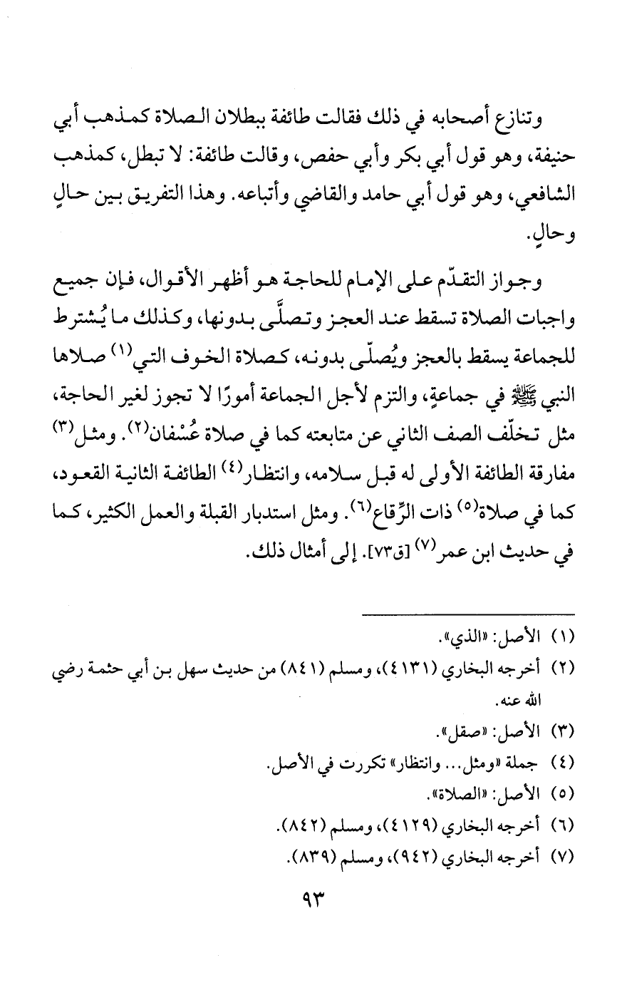 والثالث: أنه إن تقدم لحاجةٍ صحت الصلاة وإلا فلا، وهذا مذهب كثيرٍ من أهل العلم، وهو قول في مذهب أحمد. وأهل هذا القول يقولون: إذا لم يمكن الصلاةُ خلفه لزحمةٍ أو غيرها -كما قد يحصل في