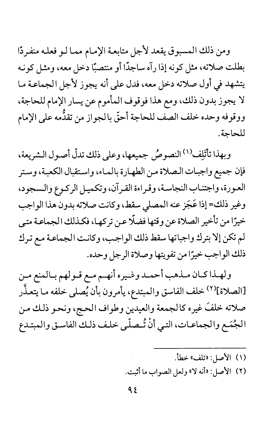 الجُمَع في بعض الأوقات، وكما قد يحصل في الجامع أحيانًا- فالصلاة أمامه جائزة، وقد نصَّ أحمد على ما مضت به السنة في حديث أم ورقة الأنصارية: أن المرأة تؤمّ الرجال عند الحاجة، كقيام رمضان إذا كانت تقرأ وَهُم لا يقرؤون، وتقف خلفهم لأن المرأة لا تقف في صفّ الرجال ولا تكون أمامهم، فنصَّ على أنّ المأمومين في هذا الموضع يكونون قدّام الإمام كما جاء في الحديث، وذلك لئلا تكون المرأة في صفّ الرجال أو تكون أمامهم، فهنا كان تقدم المأموم على الإمام أولى في الشرع من تقدم النساء على الرجال أو مصافة المرأة للرجال.