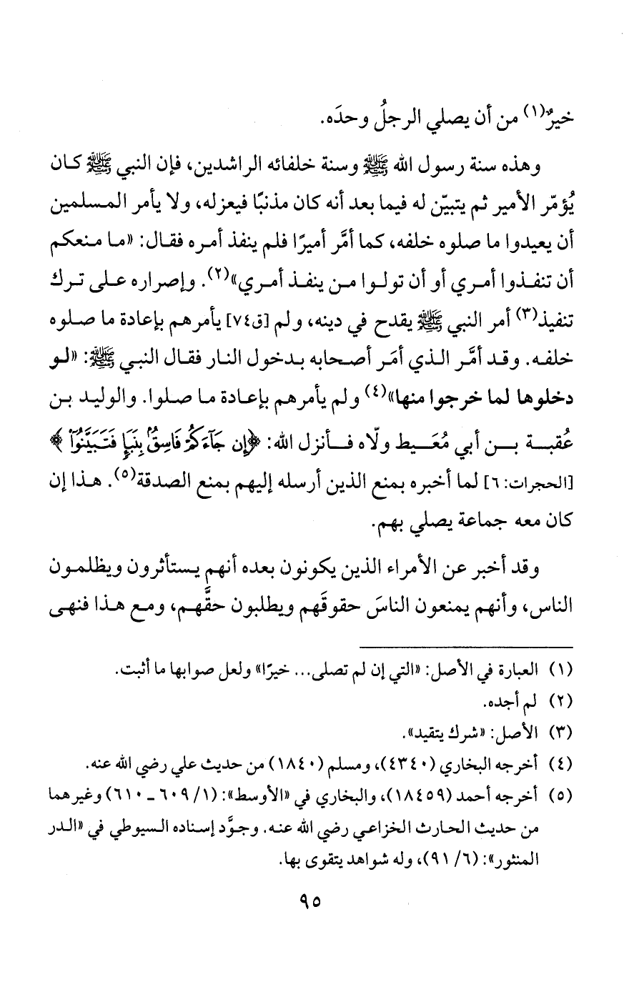 وجواز التقدّم على الإمام للحاجة هو أظهر الأقوال، فإن جميع واجبات الصلاة تسقط عند العجز وتصلَّى بدونها، وكذلك ما يُشترط للجماعة يسقط بالعجز ويُصلَّى بدونه، كصلاة الخوف التي صلاها النبي صلى الله عليه وسلم في جماعةٍ، والتزم لأجل الجماعة أمورًا لا تجوز لغير الحاجة، مثل تخلّف الصف الثاني عن متابعته كما في صلاة عُسْفان. ومثل مفارقة الطائفة الأولى له قبل سلامه، وانتظار الطائفة الثانية القعود، كما في صلاة ذات الرِّقاع. ومثل استدبار القبلة والعمل الكثير، كما في حديث ابن عمر إلى أمثال ذلك.