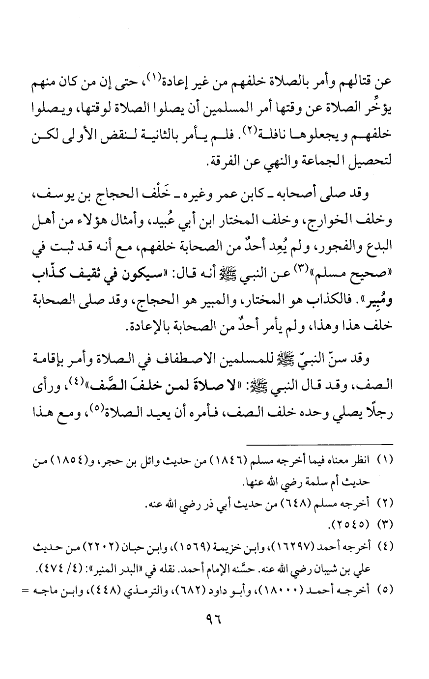 وبهذا تأتَلِف النصوصُ جميعها، وعلى ذلك تدلّ أصول الشريعة، فإن جميع واجبات الصلاة من الطهارة بالماء، واستقبال القبلة، وستر العورة، واجتناب النجاسة، وقراءة القرآن، وتكميل الركوع والسجود، وغير ذلك= إذا عَجَز عنه المصلي سقط، وكانت صلاته بدون هذا الواجب خيرًا من تأخير الصلاة عن وقتها فضلًا عن تركها، فكذلك الجماعة متى لم تكن إلا بترك واجباتها سقط ذلك الواجب، وكانت الجماعة مع ترك ذلك الواجب خيرًا من تفويتها وصلاة الرجل وحده.