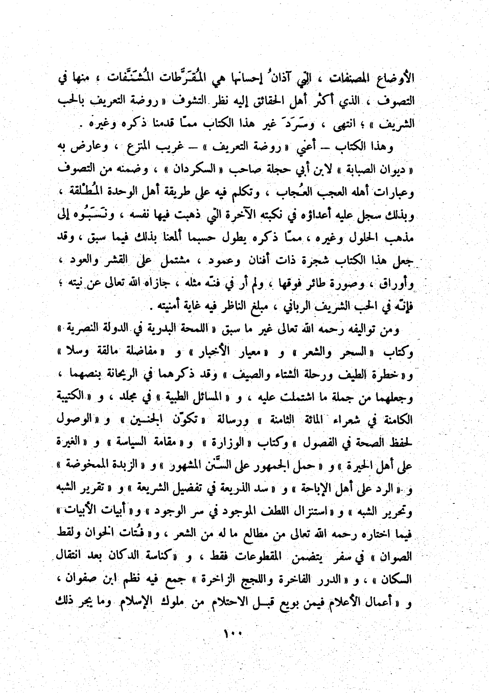 الأوضاع المصنفات، التي آذان إحسانها هي المقرّطات المشنّفات، منها في التصوف، الذي أكثر أهل الحقائق إليه نظر التشوف روضة التعريف بالحب الشريف؛ انتهى، وسرد غير هذا الكتاب ممّا قدمنا ذكره وغيره.