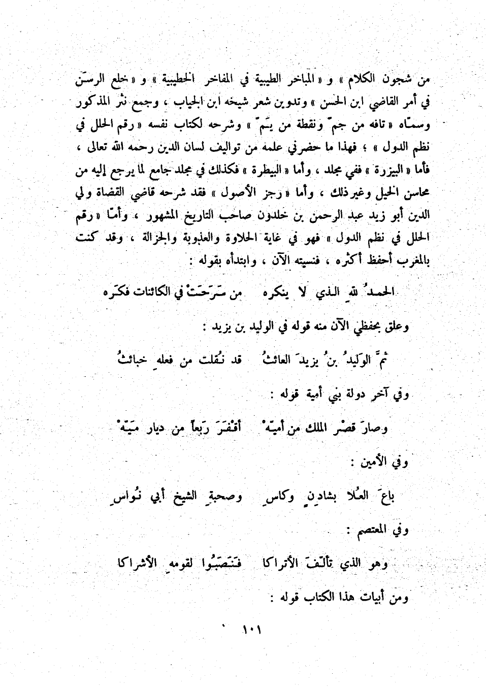 الحمد لله الذي لا ينكره ... من سرحت في الكائنات فكره وعلق بحفظي الآن منه قوله في الوليد بن يزيد: