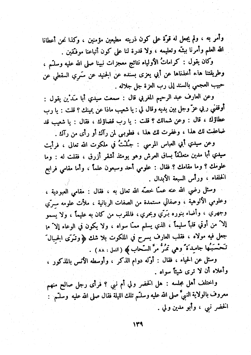 واختلف أهل مجلسه: هل الخضر ولي أم نبي فرأى رجل صالح منهم معروف بالولاية النبيّ صلى الله عليه وسلّم تلك الليلة فقال صلى الله عليه وسلّم: الخضر نبي، وأبو مدين ولي.
