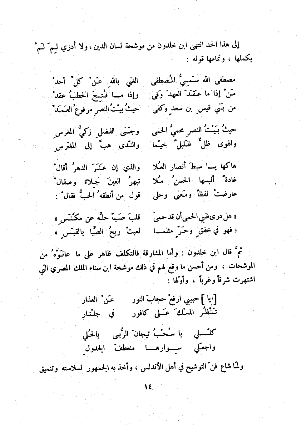 " فهو في خفقٍ وحرٍ مثلما ... لعبت ريح الصّبا بالقبس " ثمّ قال ابن خلدون: وأما المشارقة فالتكلف ظاهر على ما عانوه من الموشحات، ومن أحسن ما وقع لهم في ذلك موشحة ابن سناء الملك المصري التي اشتهرت شرقاً وغرباً، وأولها: