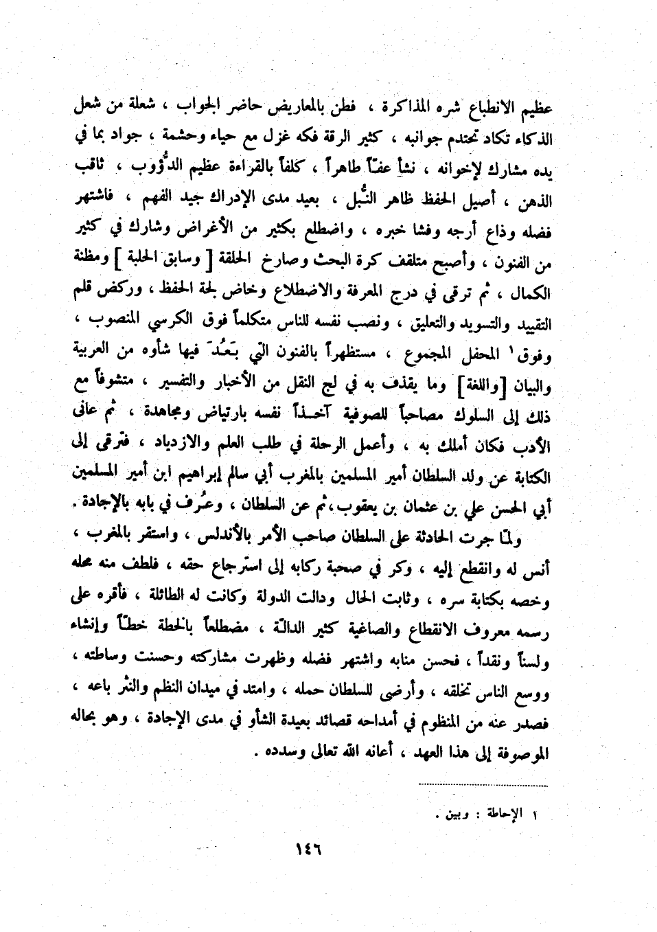 عظيم الانطباع شره المذاكرة، فطن بالمعاريض حاضر الجواب، شعلة من شعل الذكاء تكاد تحتدم جوانبه، كثير الرقة فكه غزل مع حياء وحشمة، جواد بما في يده مشارك لإخوانه، نشأ عفّاً طاهراً، كلفاً بالقراءة عظيم الدّؤوب، ثاقب الذهن، أصيل الحفظ ظاهر النّبل، بعيد مدى الإدراك جيد الفهم، فاشتهر فضله وذاع أرجه وفشا خبره، واضطلع بكثير من الأغراض وشارك في كثير من الفنون، وأصبح متلقف كرة البحث وصارخ الحلقة [وسابق الحلبة] ومظنة الكمال، ثم ترقى في درج المعرفة والاضطلاع وخاض لجة الحفظ، وركض قلم التقييد والتسويد والتعليق، ونصب نفسه للناس متكلماً فوق الكرسي المنصوب، وفوق (1) المحفل المجموع، مستظهراً بالفنون التي بعد فيها شأوه من العربية والبيان [واللغة] وما يقذف به في لج النقل من الأخبار والتفسير، متشوفاً مع ذلك إلى السلوك مصاحباً للصوفية آخذاً نفسه بارتياض ومجاهدة، ثم عانى الأدب فكان أملك به، وأعمل الرحلة في طلب العلم والازدياد، فترقى إلى الكتابة عن ولد السلطان أمير المسلمين بالمغرب أبي سالم إبراهيم ابن أمير المسلمين أبي الحسن علي بن عثمان بن يعقوب، ثم عن السلطان، وعرف في بابه بالإجادة.
