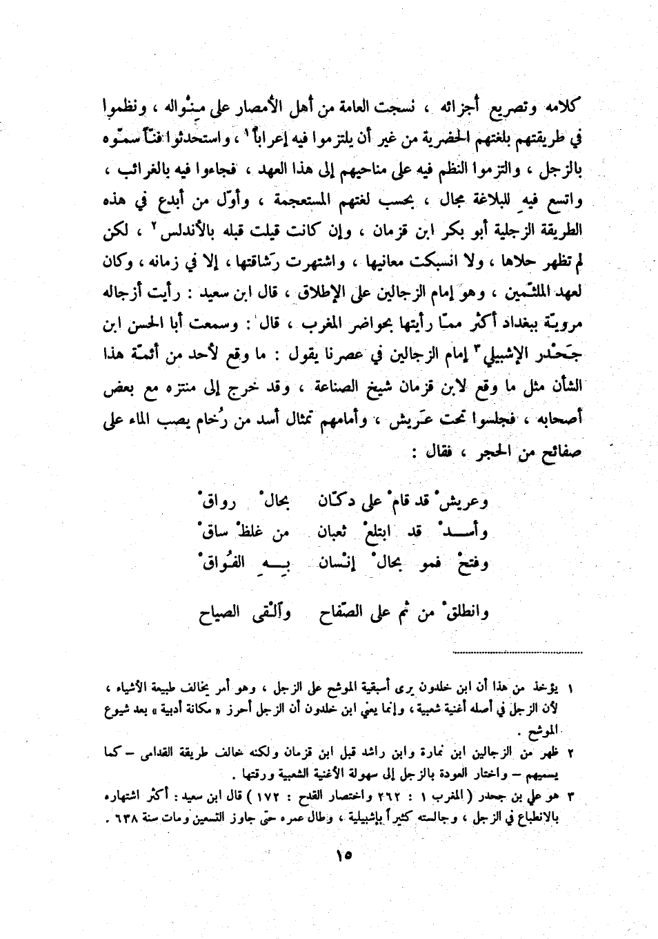 (1) يؤخذ من هذا أن ابن خلدون يرى أسبقية الموشح على الزجل، وهو أمر يخالف طبيعة الأشياء، لأن الزجل في أصله أغنية شعبية، وإنما يعني ابن خلدون أن الزجل أحرز " مكانة أدبية " بعد شيوع الموشح.