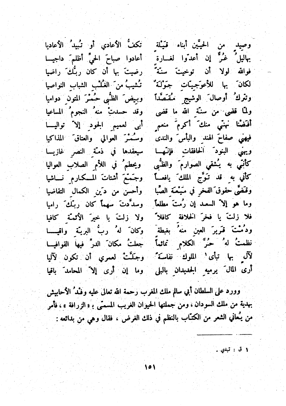 أرى المال يرميه الجديدان بالبلى ... وما إن أرى إلاّ المحامد باقيا وورد على السلطان أبي سالم ملك المغرب رحمة الله تعالى عليه وفد الأحابيش بهدية من ملك السودان، ومن جملتها الحيوان الغريب المسمّى بالزرافة، فأمر من يعاني الشعر من الكتّاب بالنظم في ذلك الغرض، فقال وهي من بدائعه: