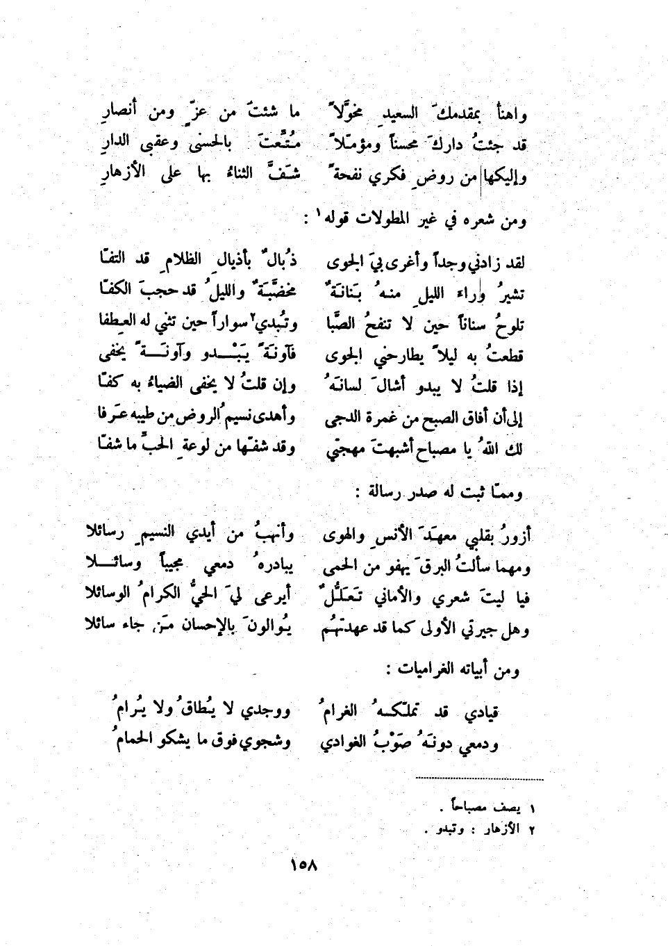 وإليكها من روض فكري نفحةً ... شفّ الثناء بها على الأزهار ومن شعره في غير المطولات قوله (1) :