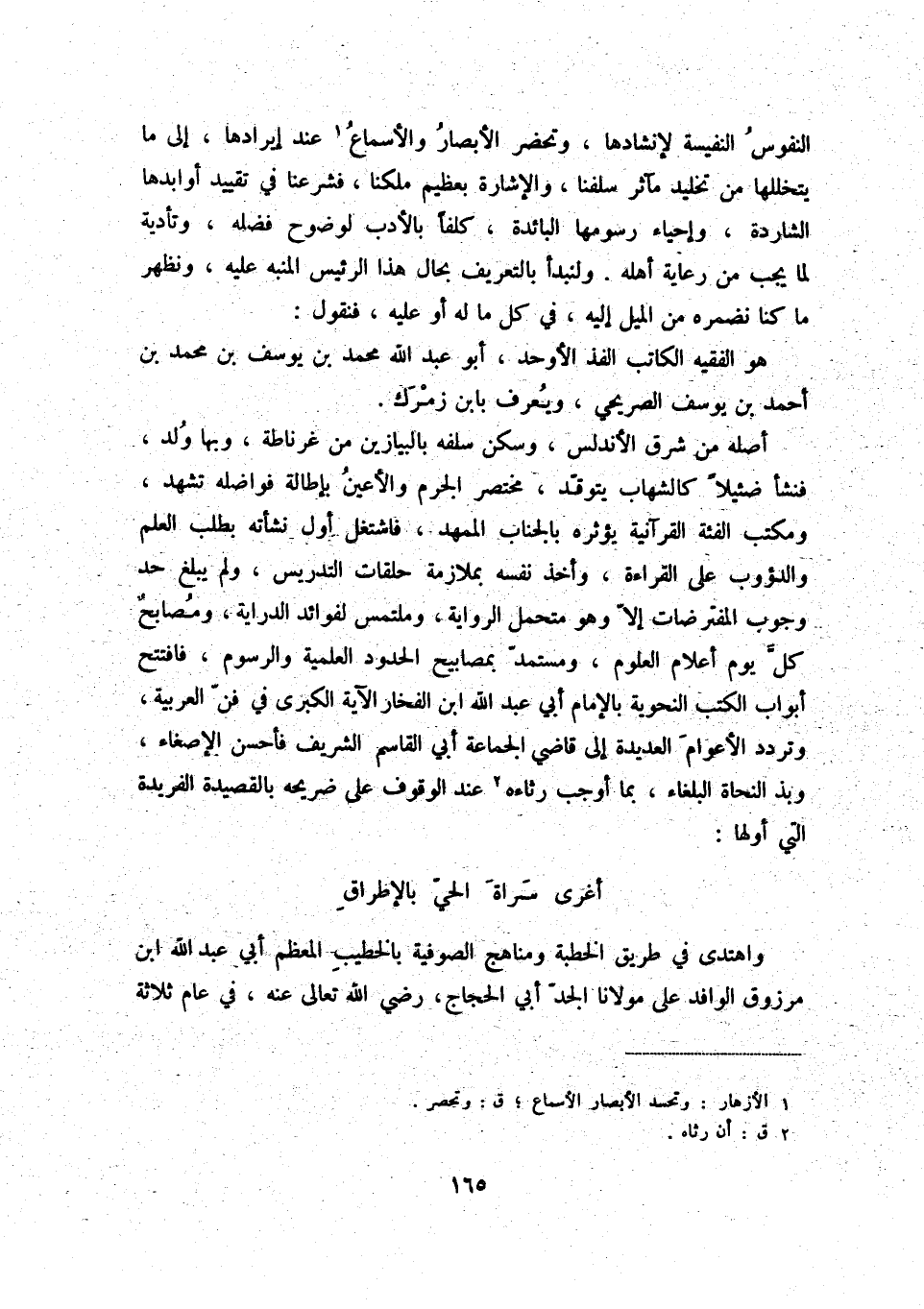 أغرى سراة الحيّ بالإطراق ... واهتدى في طريق الخطبة ومناهج الصوفية بالخطيب المعظم أبي عبد الله ابن مرزوق الوافد على مولانا الجدّ أبي الحجاج، رضي الله تعالى عنه، في عام ثلاثة
