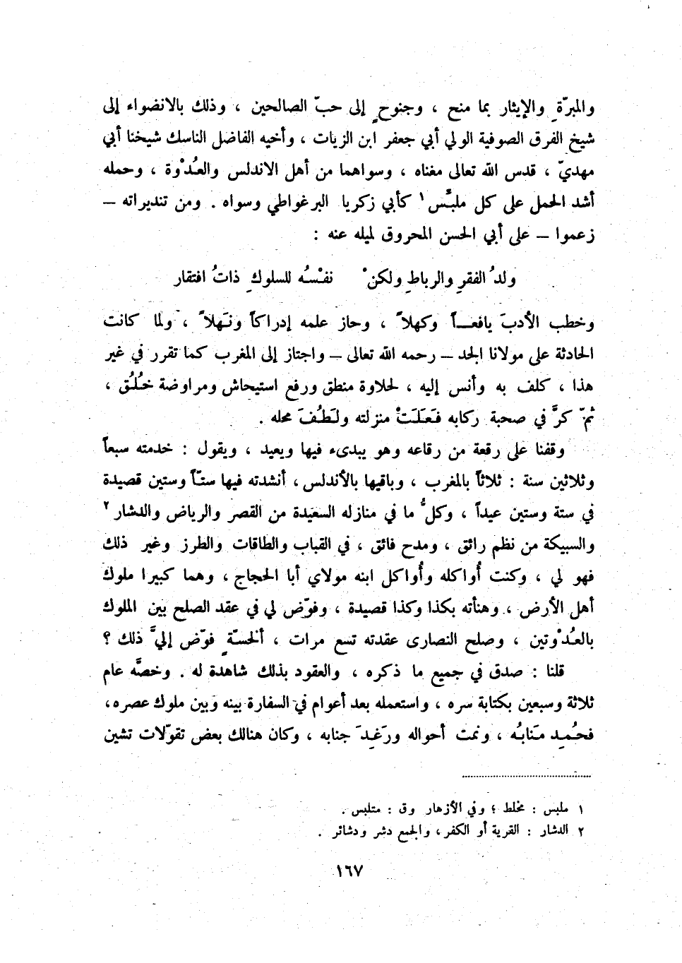 والمبرّة والإيثار بما منح، وجنوحٍ إلى حبّ الصالحين، وذلك بالانضواء إلى شيخ الفرق الصوفية الولي أبي جعفر ابن الزيات، وأخيه الفاضل الناسك شيخنا أبي مهديّ، قدس الله تعالى مغناه، وسواهما من أهل الاندلس والعدوة، وحمله أشد الحمل على كل ملبّس (1) كأبي زكريا البرغواطي وسواه. ومن تنديراته - زعموا - على أبي الحسن المحروق لميله عنه: