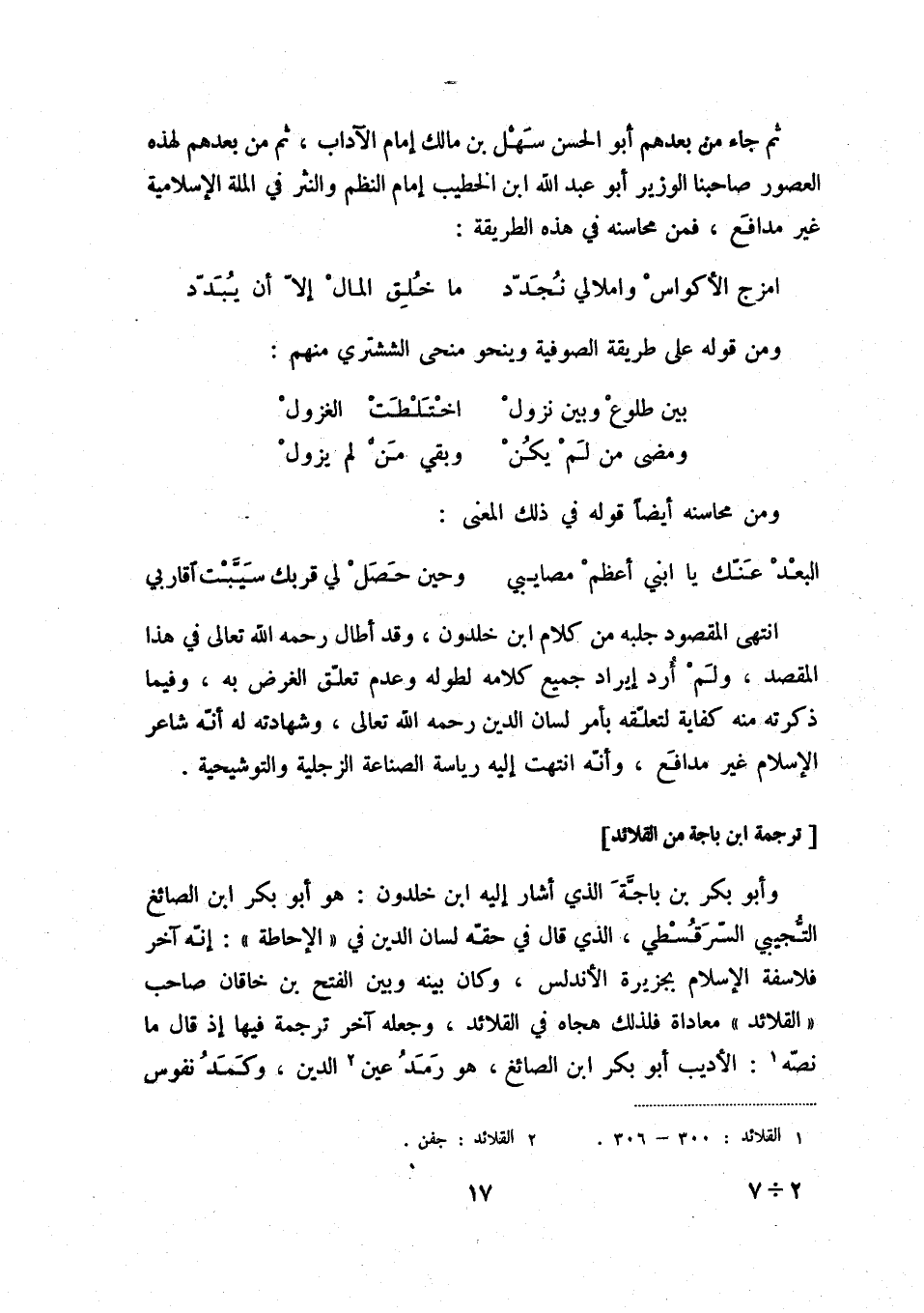 وأبو بكر بن باجّة الذي أشار إليه ابن خلدون: هو أبو بكر ابن الصائغ التجيبي السّرقسطي، الذي قال في حقّه لسان الدين في الإحاطة: إنّه آخر فلاسفة الإسلام بجزيرة الأندلس، وكان بينه وبين الفتح بن خاقان صاحب القلائد معاداة فلذلك هجاه في القلائد، وجعله آخر ترجمة فيها إذ قال ما نصّه (1) : الأديب أبو بكر ابن الصائغ، هو رمد عين (2) الدين، وكمد نفوس